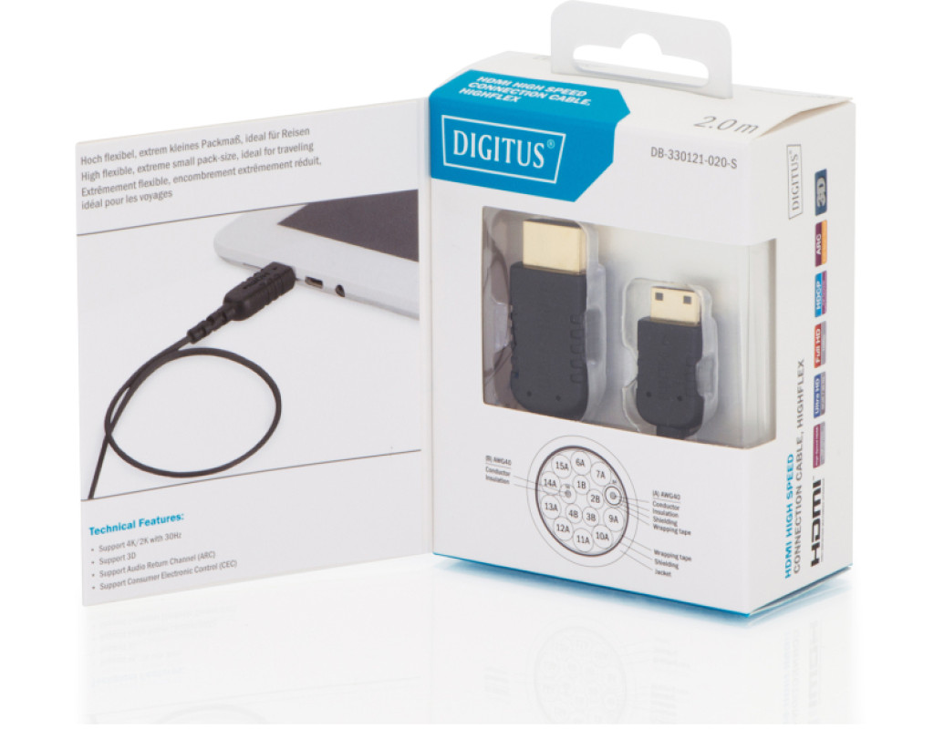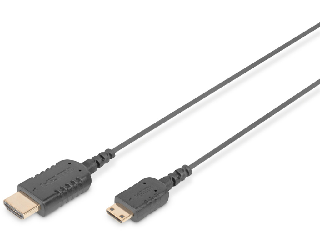 | Кабель з підтримкою UHD і Full 3D використовується для підключення аудіо-відео пристроїв з інтерфейсом Mini HDMI (тип C), таких як ноутбуки, до телевізора, монітора або ПК. Подвійний екранований кабель з’єднує роз’єм HDMI із роз’ємом Mini HDMI. Підтримуються ARC і CEC і роздільність до 4K. Також кабель характеризується малим діаметром і високою гнучкістю. |