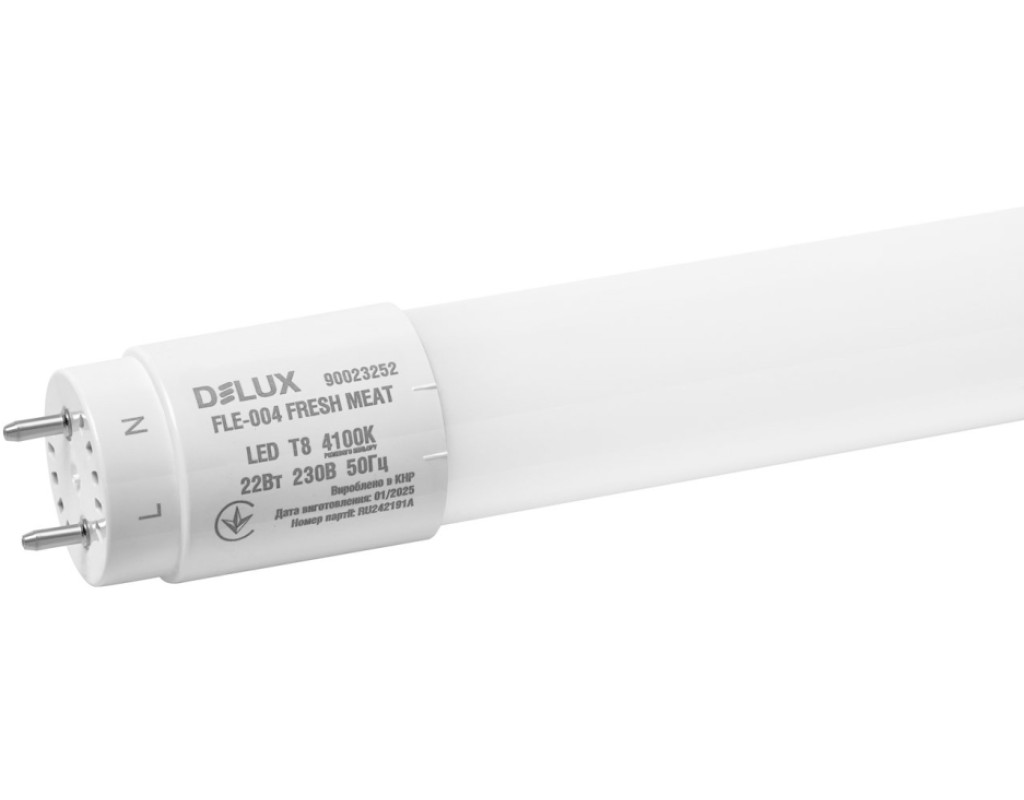 Світлодіодна лампа Delux FLE-004 (Fresh Meat) потужністю 22 Вт і довжиною 1.5 м — це професійне рішення для підсвічування м’ясних вітрин, створене спеціально для потреб торговельних мереж. Завдяки спектру світла з температурою 2500–3000 K (рожеве або тепле біле світло), лампа підкреслює природні червоні відтінки м’яса, надаючи продукту більш свіжого та апетитного вигляду. Завдяки формату T8 і стандартному цоколю G13, лампа легко встановлюється в холодильні прилавки та інші комерційні освітлювальні системи. Вона забезпечує енергоефективне, безпечне та довговічне освітлення, розраховане на інтенсивне використання у супермаркетах, гастрономах, м’ясних магазинах та на ринках. |