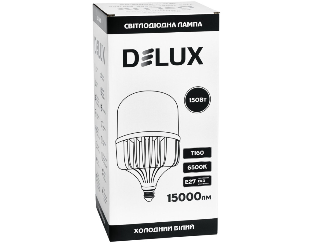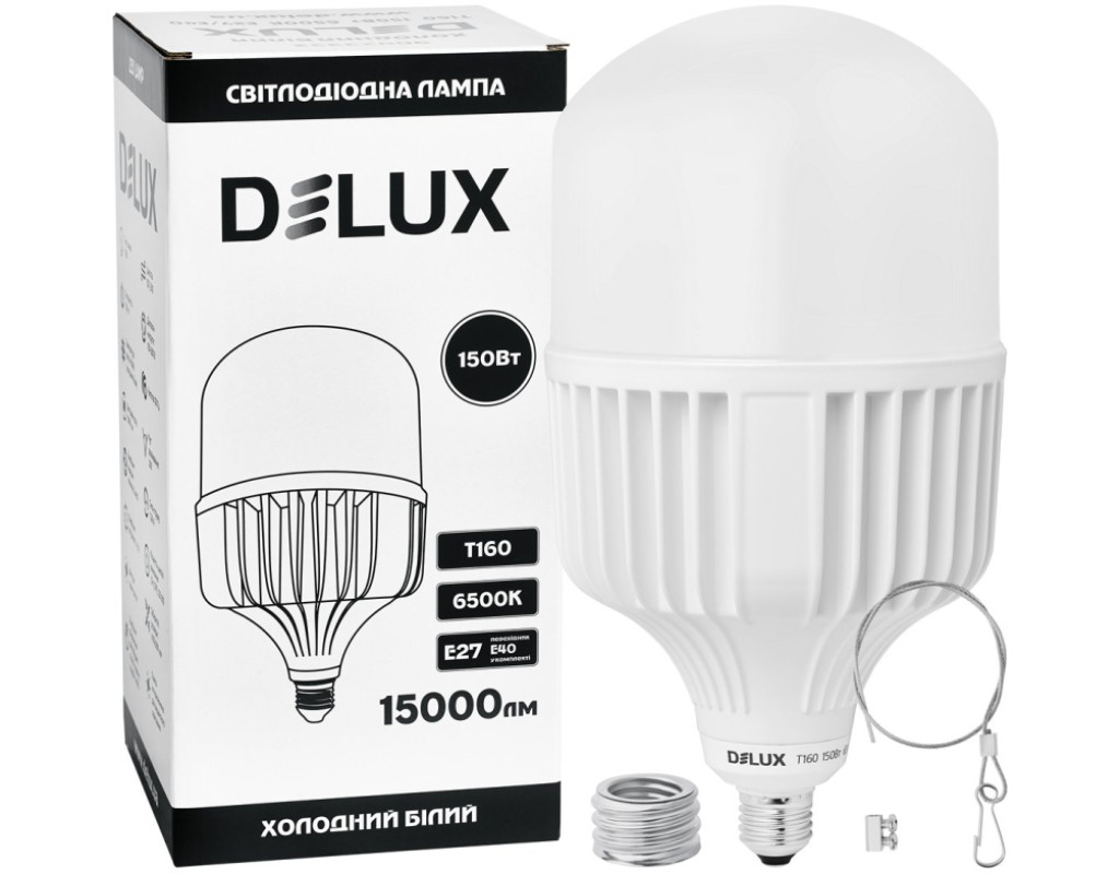Тип лампи - світлодіодні (LED), тип цоколя - E27, Потужність - 150 Вт, колірна температура - 6500 К, 220-240 В, Особливості - перехідник на E40, енергоефективність 80% (A +), Высота - 290 мм