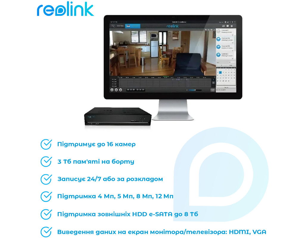 16-канальний PoE відеореєстратор для безперервного запису 24/7 Підтримка камер до 12 Мп | 4 ТБ HDD у комплекті Безперервний запис 24/7 Обирайте відеореєстратор NVS16, якщо вам потрібен цілодобовий відеозапис або якщо у вас є кілька IP-камер: - попередньо встановлений жорсткий диск 4 ТБ для цілодобового запису та моніторингу. - підтримка запису з усіх камер одночасно (до 16 камер). - функція “запис при виявленні руху” запускає запис лише тоді, коли буде виявлено рух. Налаштуйте власну систему відеоспостереження Відеореєстратор підтримує всі IP-камери Reolink 12 Мп, 8 Мп та 5 Мп. Ви можете підключити до нього 16 камер (камери у комплект не входять) і створити власну систему відеоспостереження. Просте підключення по PoE Просте підключення – процес підключення не може бути простішим! Завдяки технології PoE (Power over Ethernet) ви підключаєте камеру одним мережевим кабелем як для живлення, так і для передачі відеосигналу. Налаштування, контроль і віддалений доступ Реєстратор можна підключити до монітора або телевізора за допомогою кабелю HDMI або VGA. Налаштувати та керувати системою відеонагляду зручно через додаток Reolink на мобільному пристрої (iOS, Android), Reolink Client на комп’ютері (Windows, MacOS) або через веб-браузер. Cтворюйте свою професійну, надійну систему відеоспостереження з відеореєстратором NVS16 із камерами Reolink PoE. Ви можете переглядати відео наживо, відтворювати будь-яке записане відео, створювати резервні копії локальних даних, записувати TimeLapse відео тощо. |