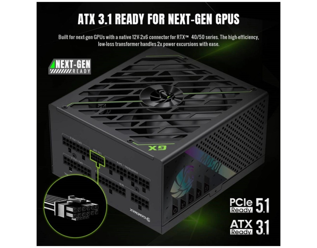 | Модульний блок живлення GX PRO 1050G 80 Plus Gold: готовий до ATX3.1, безшумне охолодження та преміальна довговічність • Ефективність та тиха робота 80 Plus Gold: досягає 90% ефективності при типових навантаженнях завдяки конструкції APFC+LLC+DC-DC, мінімізуючи втрати енергії та шум. • Преміальна довговічність та надійність: виготовлений з японських конденсаторів 105°C та твердотільних конденсаторів для довготривалої стабільності та продуктивності. • Готовий до ATX3.1 та PCIe5.1: має вбудований роз'єм 12V-2x6 для безперебійної сумісності з відеокартами RTX 40/50 та ефективного живлення. • Розширене терморегулювання: 13,5-см вентилятор FDB з інтелектуальним контролем температури забезпечує тихе охолодження та оптимальне розсіювання тепла. • Модульна конструкція та надійний захист: повністю модульна конструкція з двоступеневим фільтром електромагнітних перешкод та захистом від перенапруги за допомогою терморезистора NTC, а позолочені кабелі забезпечують міцні з'єднання з високою провідністю. |