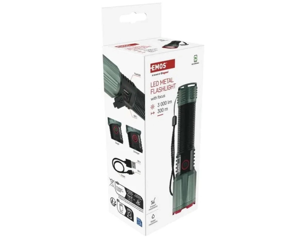 Ліхтар EMOS P3122 — це потужний, перезаряджуваний світлодіодний ліхтар з яскравістю до 3000 люмен і дальністю освітлення до 300 метрів. Ударостійкий корпус з алюмінію з захистом від вологи IP43 робить його ідеальним для професійного використання: на будівництві, в рятувальних службах або в побуті. Характеристики:
