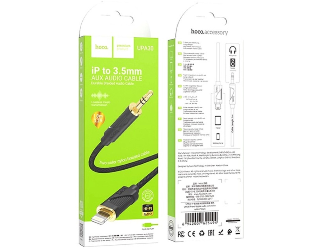 | Аудіокабель HOCO UPA30 Friend iP to 3.5 mm призначений для підключення пристроїв з роз’ємом для навушників 3.5 мм до пристроїв з портом Lightning. Це корисне рішення для смартфонів, планшетів або ноутбуків Apple, де традиційний роз’єм для навушників відсутній. Кабель дозволяє використовувати старе аудіообладнання з новими пристроями, що мають 8-контактні порти. Гарантує передачу якісного звуку без спотворень, що робить його ідеальним вибором для меломанів. Кабель створює оптимальне поєднання комфортного використання та високої продуктивності: він чудово підходить для повсякденного використання, забезпечуючи достатній радіус дії та зручність транспортування. Конектори кабелю стійкі до корозії, мінімізують втрати сигналу, гарантують надійне з’єднання та чистоту звуку. Щільне зовнішнє нейлонове обплетення не рветься, підвищує зносостійкість кабелю та запобігає заплутуванню проводу, забезпечуючи зручність зберігання та використання. |