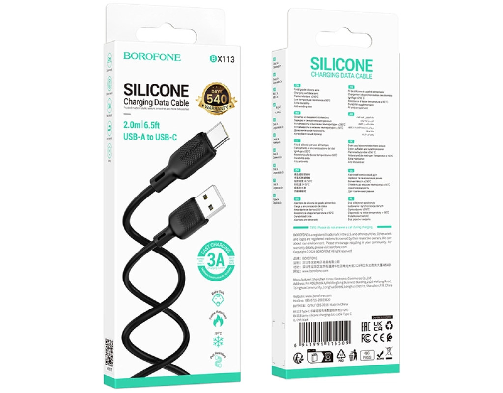 Кабель Borofone BX113 Lenny USB-A to USB-С — це стильний та функціональний кабель у м’якому силіконовому обплетенні, призначений для ефективної зарядки, синхронізації та передачі даних між пристроями. Струм до 3 A оптимізований для підтримки швидкого заряджання ваших девайсів. Кабель забезпечує надійну та стабільну передачу даних між пристроями, а мала вага та довжина 2 м роблять його зручним для використання вдома або в офісі. Силіконове обплетення не тільки надає кабелю стильного вигляду, але й зміцнює його, роблячи більш стійким до зносу і запобігаючи заплутуванню.