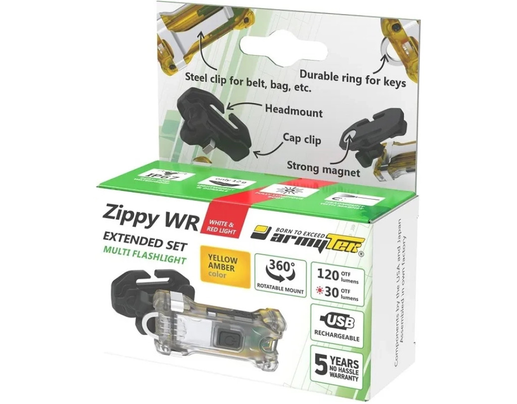 | Ліхтар Armytek Zippy WR Extended Set Yellow (F09101Y) – це надзвичайно компактний та функціональний аксесуар, який стане незамінним у вашій повсякденній рутині. Його багатофункціональність дозволяє використовувати як налобник, ручний ліхтар чи стильний брелок для ключів. Легкість і міцність пластикового корпусу, вага всього 12 грамів, ставлять його на перше місце серед мініатюрних ліхтарів. Цей ліхтар обладнаний високоякісним білим світлодіодом LH351B, здатним забезпечити яскравість до 120 люменів із дальністю світлового потоку до 12 метрів. Його кут освітлення досягає 110°, що надає можливість охоплювати широкий простір, ідеально підходить для роботи в темних приміщеннях або на відкритих просторах. Поєднання з червоним діодом, який видає яскравість у 30 люменів, робить Zippy WR підходящим для будь-якого середовища, де необхідне обережне освітлення, наприклад, при читанні карт уночі, не привертаючи надмірної уваги. Серед особливостей цього пристрою – десять режимів роботи з різними рівнями яскравості: п'ять для білого світла і п'ять для червоного. Зручне перемикання між режимами забезпечується одним натисканням кнопки управління. Ще однією перевагою є захист від випадкового включення, що зберігає заряд акумулятора під час зберігання або транспортування. Комплект Armytek Zippy WR Extended Set включає еластичне налобне кріплення з можливістю регулювання кута освітлення на 360°, а також металеву кліпсу для фіксації на одязі. Це доповнює універсальність використання, роблячи прилад зручним у будь-якій ситуації. Ліхтар забезпечує високий рівень захисту за стандартом IP67, що робить його вологонепроникним і стійким до ударів. Він може витримувати падіння з висоти до 12 метрів, забезпечуючи безперебійну роботу навіть в екстремальних умовах. Вбудований літій-полімерний акумулятор на 100 мАг дозволяє пристрою працювати до 220 годин у мінімальному режимі яскравості. Зарядити його легко за допомогою зручного кабелю Micro USB, що входить до комплекту. Ліхтар Armytek Zippy WR Extended Set Yellow поєднує у собі інноваційні технології і високу якість, укомплектовані в суперкомпактному корпусі. Це ідеальний вибір для людей, яким потрібен надійний і потужний інструмент у невеликому форматі. Чи це похід, риболовля, або щоденне використання у місті — Zippy WR буде вашим надійним і стильним помічником. |