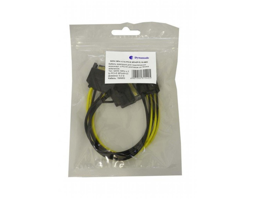 Кабель живлення SATA 15Pin x 2 to PCI-E 8Pin (6 + 2) 18 AWG Dynamode - кабель живлення для відеокарт PCI Express 8 pin. Використовується як перехідник з 2-х Sata тато на живлення 8 pin (6пін + 2пін) для відеокарт з роз'ємом PCI-Express, яким необхідно додаткове живлення від блоку живлення. |