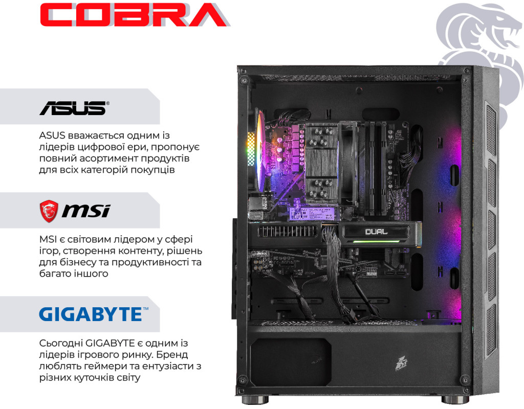 | COBRA поєднує в собі високу продуктивність, потужність і сучасні технології. Ультра графіка Топові відеокарти забезпечать максимальну, і безкомпромісну продуктивність в самих вимогливих іграх і додатках. Ігри в ультра настройках графіки - тепер ти зможеш побачити світ сучасних ігор очима розробників, оцінити їх так, як вони були задумані, а не миритися і підлаштовуватися. Топові процесори Старша лінійка процесорів - верх продуктивності і приємний запас для комфортної роботи з великими масивами даних, складними іграми, обробкою великих обсягів мульти-медіа контенту. Безпрецедентна потужність, і малий час відгуку разом з вбудованими засобами безпеки дозволяють працювати, грати і створювати контент так швидко і так ефективно, як ви захочете. Абсолютна міць твого ПК від COBRA Ігрові комп"ютери COBRA з максимальною конфігурацією зібрані спеціально для самих просунутих користувачів і вимогливих до якості графіки геймерів. Дана лінійка дозволить насолодитися ультра налаштуваннями графіки і максимальною роздільною здатністю в усіх сучасних іграх, зберігаючи максимально доступні показники FPS. Кращого просто не існує! ПК COBRA збираються на базі комплектуючих визнаних світових лідерів, таких як Intel, AMD, ASUS, MSI, Gigabyte, і ін. Професійна збірка комп"ютера COBRA забезпечить оптимальний повітряний потік всередині корпусу, а значить і відмінне охолодження всіх компонентів ПК. |
