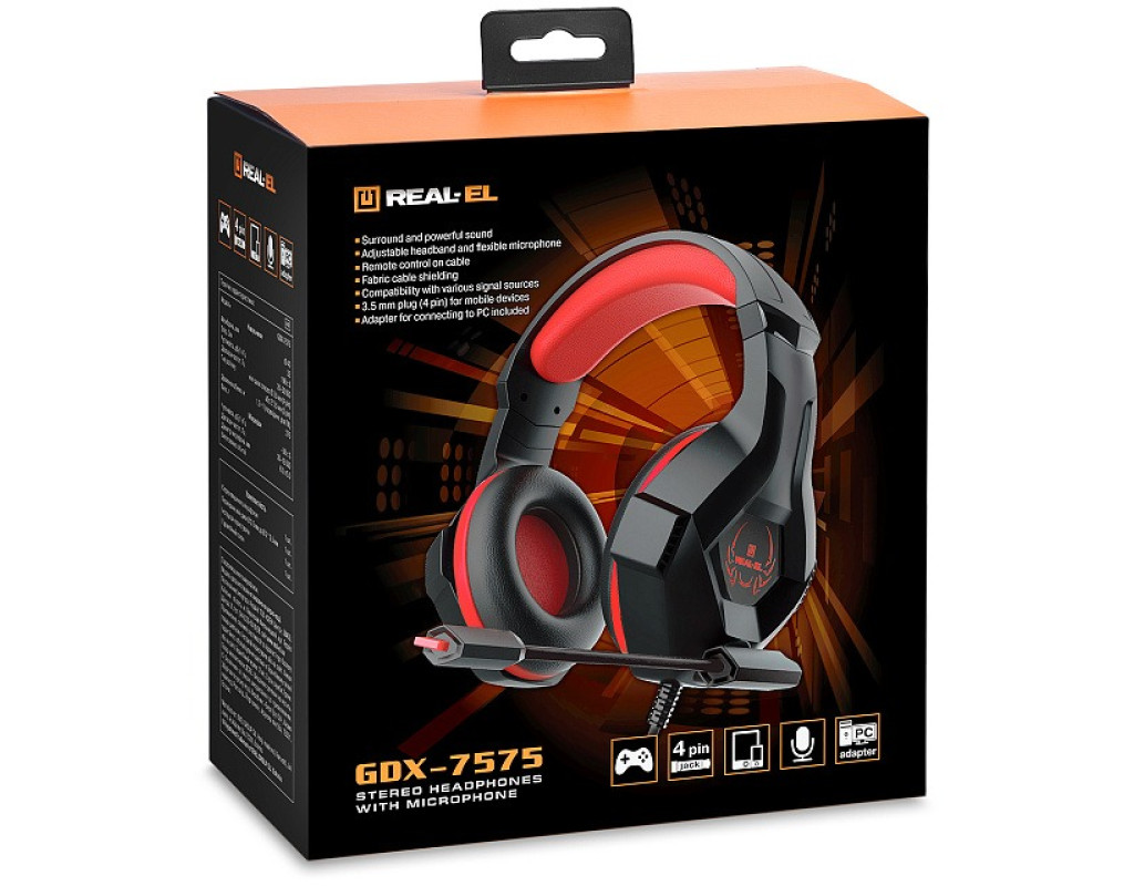 | Гарнітура REAL-EL GDX-7575 Black/Red – це стильні навушники з мікрофоном, які поєднують у собі високу якість звуку, комфорт носіння та естетичну привабливість. Чорно-червона кольорова гама надає їм ефектного вигляду, роблячи їх привабливим аксесуаром для геймерів і всіх, хто цінує стиль і функціональність.