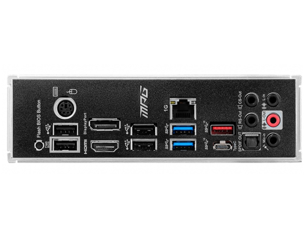 1 x DisplayPort, 1 x HDMI, 1 x optical SPDIF out, 1 x PS/2, 1 x RJ45, 1 x USB 3.2 Gen2, 1 x USB 3.2 Gen2 Type-C, 2 x USB 3.2 Gen 1, 4 x USB 2.0, 5 x Audio |