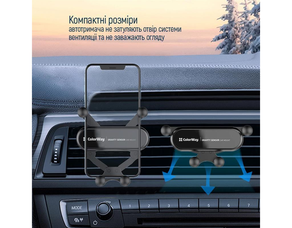 | Автомобільний тримач СolorWay для телефону Gravity Sensor Holder Black - це функціональний пристрій для смартфона, який встановлюється в дефлектор системи вентиляції автомобіля, і дозволяє зафіксувати телефон під будь-яким кутом, завдяки механізму обертання на 360 градусів. Аксесуар виготовлений з міцних матеріалів, а регулюємий механізм кріплення забезпечує надійну фіксацію смартфона в дефлектори автомобіля. Покриття фіксаторів виключає появу подряпин і потертостей на корпусі смартфона при його установці в тримач. Цей елегантний і функціональний девайс забезпечить надійну фіксацію Вашого смартфона в автомобілі, і не займе багато місця завдяки компактним розмірам.