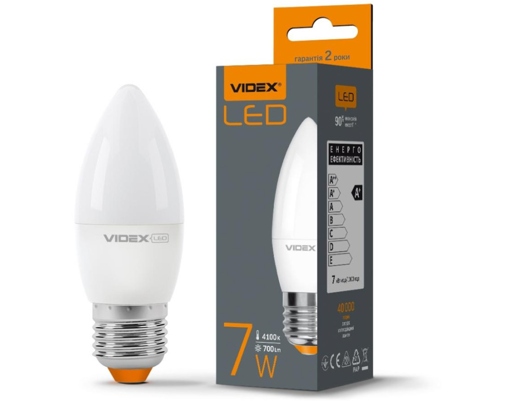 LED лампа VIDEX C37e 7W E27 4100K - високотехнологічний джерело світла. Забезпечує рівний світловий потік і максимальну потужність з першої секунди роботи. Призначена для всіх типів побутових світильників, підходить для загального освітлення приміщень, торгових залів і вітрин, промислових підприємств. Ідеальна для декоративного, місцевого та спрямованого освітлення. Світлодіодні лампи покращують якість штучного освітлення, а також допомагають економити на комунальних платежах. Завдяки мінімальній спотворення природних кольорів, якісному світла, різноманітності моделей і малому енергоспоживанню - світлодіодні лампи стали головним джерелом світла у всіх сферах людської діяльності. Особливості - Енергоефективність освітлення 90% (A +). - Захист від стрибків напруги в діапазоні від 175 до 250В. - Рівномірний яскраве освітлення без мерехтінь, функція миттєвого включення і відсутність ультрафіолетового випромінювання. - Ефективний тепловідвід через корпус лампи - Величезний ресурс роботи - 40 000 годин (що дорівнює щоденній, 12-ти годинний роботі протягом дев'яти років.) - Сумісна з вимикачами з підсвічуванням |