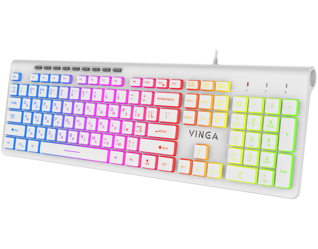 | Vinga KB460 - мультимедійна клавіатура, обладнана системою підсвічування, в якій присутні всі кольори веселки. KB460 підключається до ПК через кабель завдовжки 1.5 метра, на кінці якого розміщено інтерфейс USB. Клавіатура має мембранну конструкцію - в ній між кнопками та контактними мікросхемами прокладено силіконову плівку. Така технологія має вагому перевагу: плата захищається від подряпин і прямого попадання крапель рідини. Функціонал виробу підтримує 3 мовні розкладки. На кнопках зображені українські, англійські та російські літери. Всього в моделі 104 клавіші, серед яких є повний ряд F1 - F12 і калькуляційний комплекс NumPad, а також 9 додаткових клавіш. |