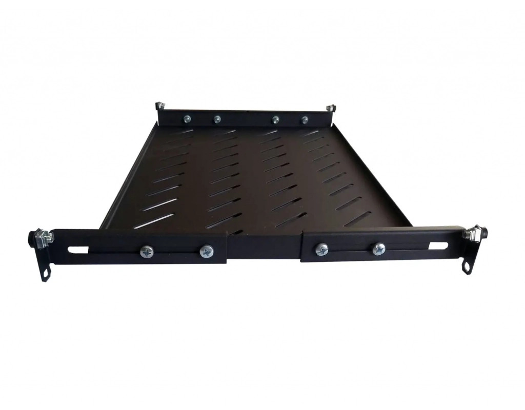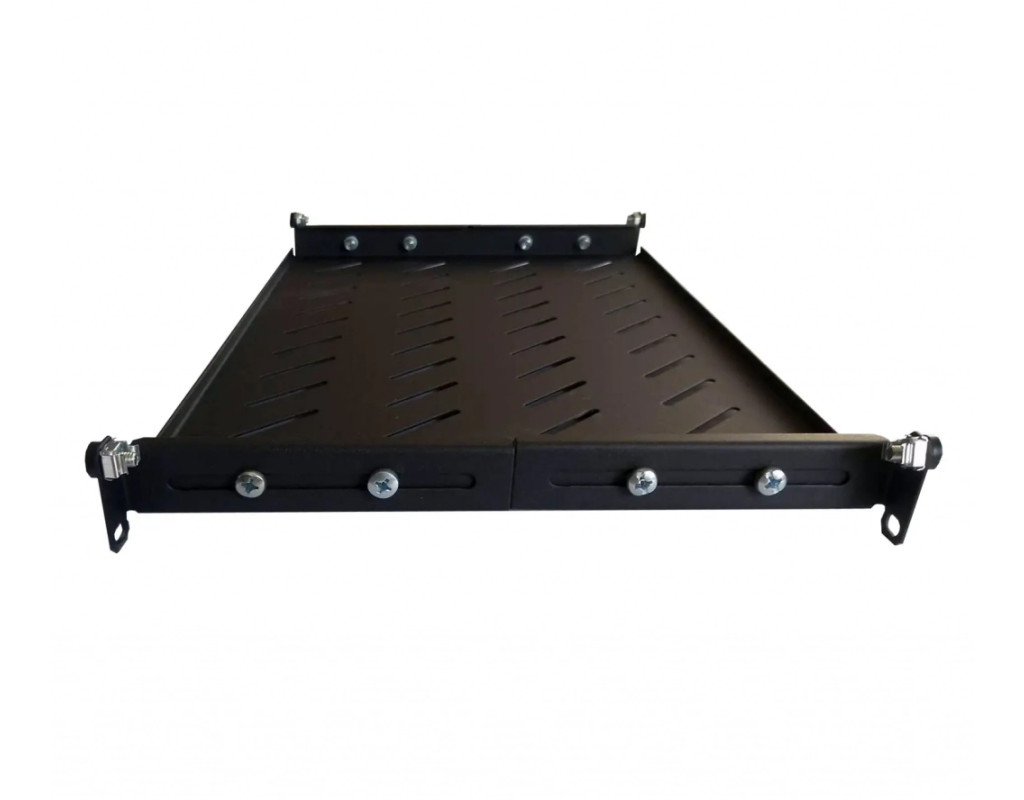 Стаціонарна полиця U-FS-45-BLACK 19" з кріпленням в 4 точках універсальна. Для забезпечення охолодження нагрітого всередині шафи повітря шляхом конвекції, в полицях передбачені вентиляційні отвори (перфорація). Комплектується регульованими по глибині установчими направляючими, завдяки яким полки можуть бути встановлені в шафах будь-яких виробників. Підходить для установки в 19 дюймові шафи глибиною 450 мм. Характеристики: