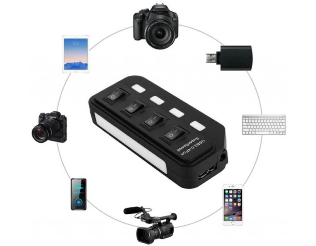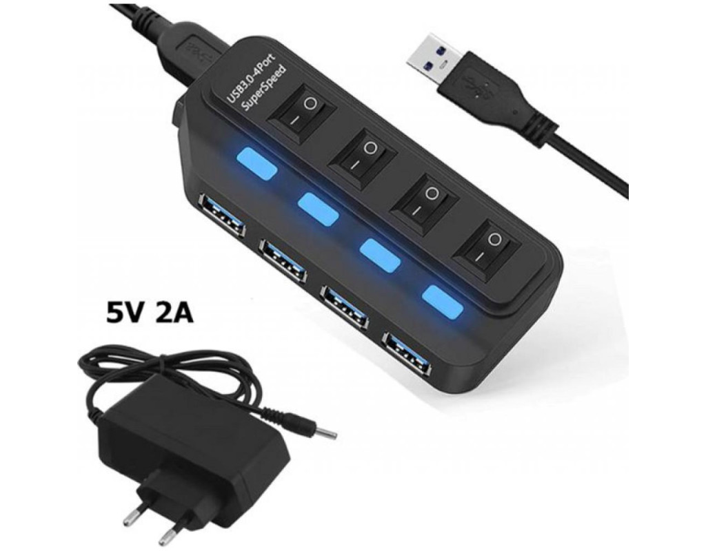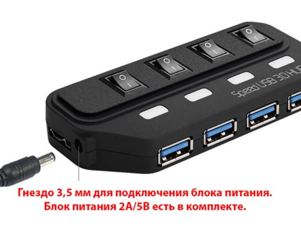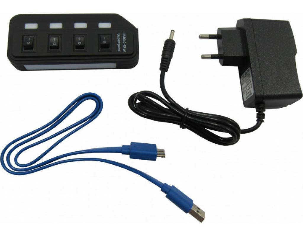 Тип - зовнішній, Інтерфейс підключення - USB 3.0, Вихідні роз'єми - 4 x USB 3.0, з блоком живлення, вимикач на кожен порт, Також шукають - з блоком живлення