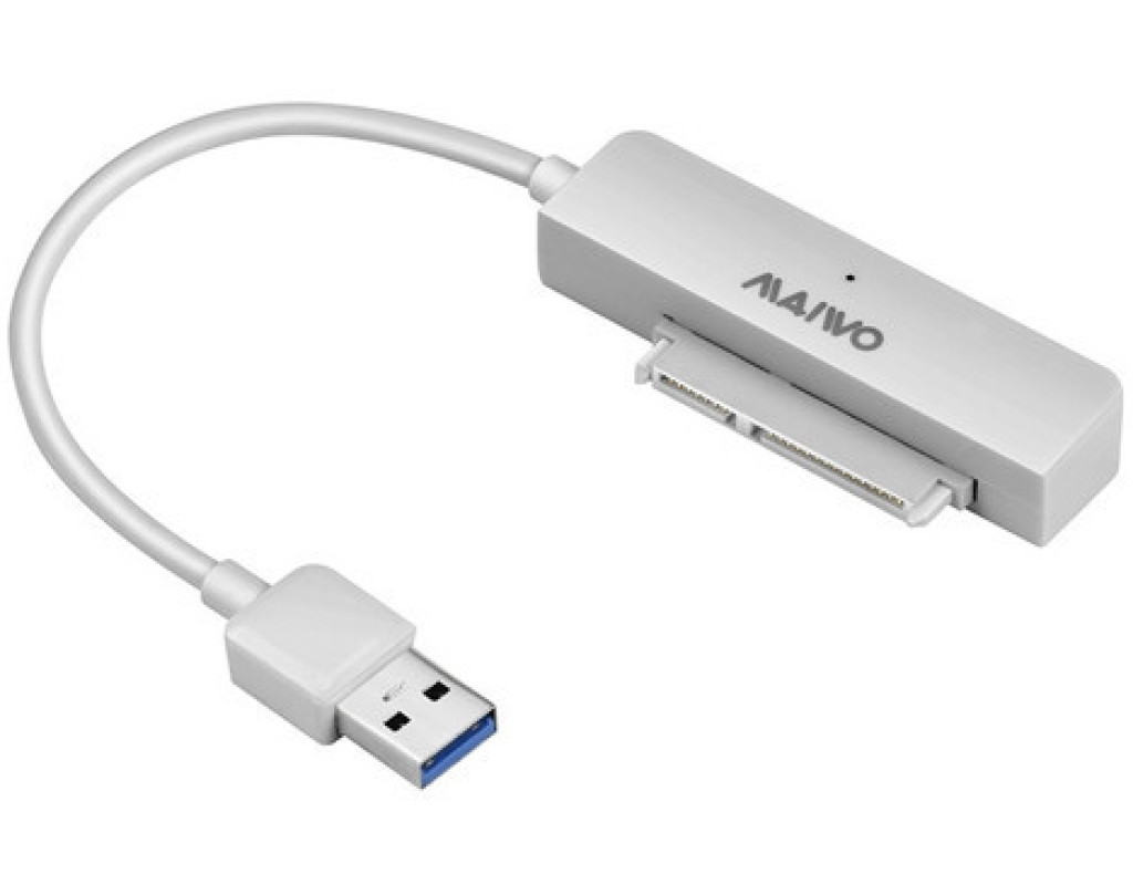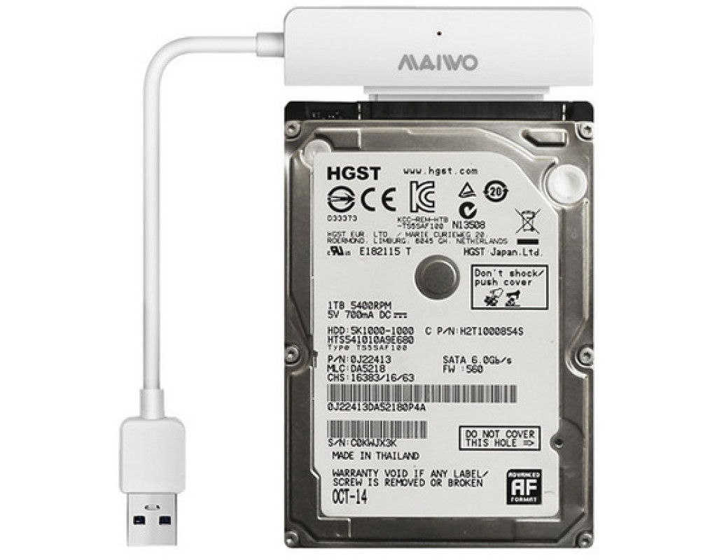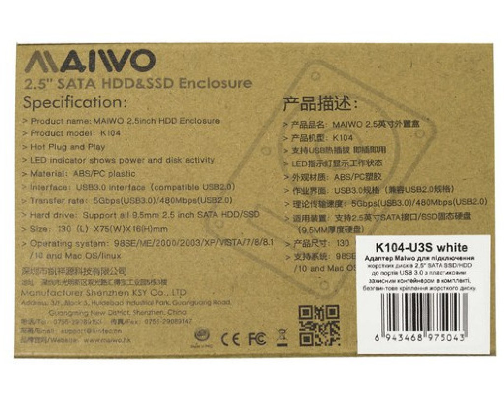 Карман зовнішній Maiwo K104-U3S white Контейнер Maiwo захисний для HDD 2,5" + адаптер для підключення HDD 2,5" SATA/SSD до порту USB3.0, використовуються разом як безгвинтова кишеня, також SATA-адаптер можна використовувати окремо без контейнера, швидкість передачі даних по USB 3.0 - до 5 Гбіт/с. |