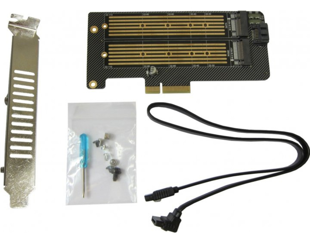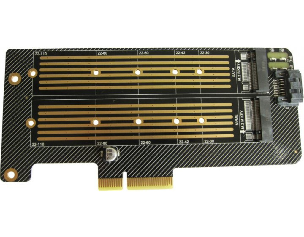 Плата розширення Dynamode "PCI-Ex4- 2xM.2 M&B-key" призначена для встановлення одного або двох твердотілих накопичувачів: M.2 NVMe M-key SSD у стандартний слот материнської плати: PCI-E 4x/PCI-E 8x/PCI-E 16x і/або M.2 NGFF B-key SSD у SATA-порт. Підтримує одночасно один M.2 NVMe (PCIe) M-key SSD і другий M.2 NGFF B-key SATA 6Gbps SSD. Отже, цей адаптер перетворює один інтерфейс M.2 (M-Key) на інтерфейс PCIe 3.0 x4 (сумісний з PCIe 2.0/PCIe 1.0), а другий інтерфейс M.2 (B-Key) — на інтерфейс SATA 6 Гбіт/с (потрібно з'єднання SATA, кабель входить до комплекту). Швидкість передавання даних у M.2 NVMe SSD набагато вища, ніж M.2 NGFF SATA SSD. Адаптер підтримує 5 типорозмірів M.2 SSD: 2230, 2242, 2260, 2280, 22110. На текстоліті адаптера є 4 шт. LED-індикатора. Характеристики: