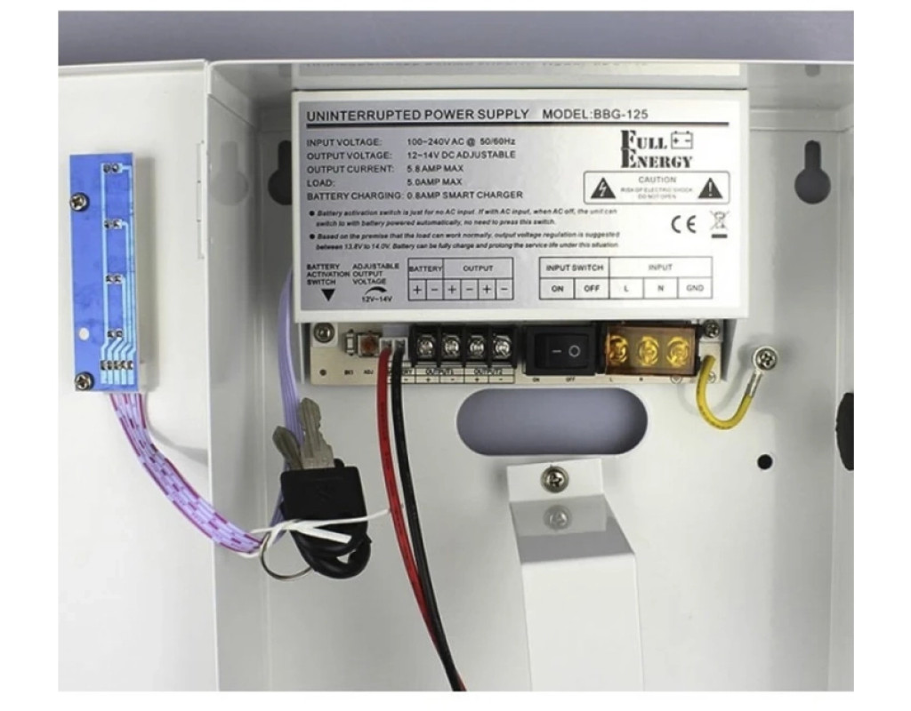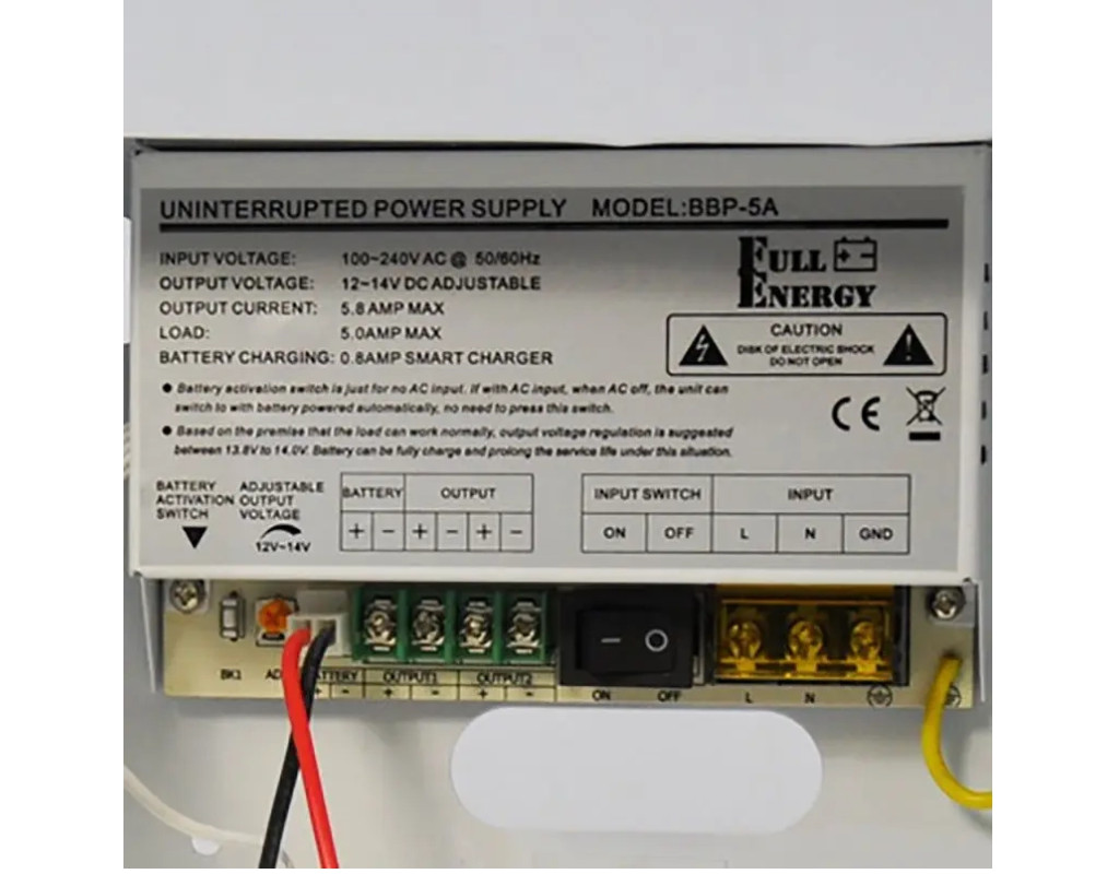 Блок безперебійного живлення Full Energy BBG-125 дозволяє захистити охоронну сигналізацію від стрибків напруги та тим самим уберегти її від виходу з ладу. Безперебійний блок імпульсний одноканальний. Вихідна напруга 12В – 14.2В. Можливе встановлення акумулятора 1,2Ah, 2.2Ah, 4Ah, 7Ah. Корпус металевий з кришкою та замком. У блоці безперебійного живлення Full Energy BBG-125 є захист від: