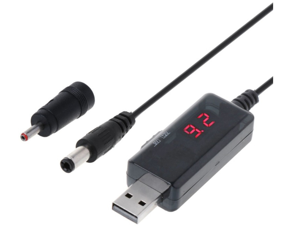KWS-912V - підвищувальний перетворювач напруги з 5 В до 9 або 12 В. Він дає змогу використовувати USB-порт повербанка або ноутбука як джерело живлення для периферійних пристроїв із напругою 9 В / 12 В. Вибір необхідної напруги 9 В або 12 В регулюється перемикачем на корпусі перетворювача і відображається за допомогою LED індикатора. За допомогою KWS-912V можна живити роутер Wi-Fi у квартирі від зарядженого повербанка через USB-порт, коли немає світла. Він підійде для більшості моделей Wi-Fi роутерів, у яких у характеристиках на нижньому боці написано 9 В або 12 В і терміналів ONU (GPON), а також для відеореєстраторів, освітлювальних приладів і навіть невеликих LCD-телевізорів із виносним блоком живлення. Наприклад, він підходить для роутерів Xiaomi Router AC1200, TP Link Archer C6 і до багатьох інших моделей. Характеристики:
