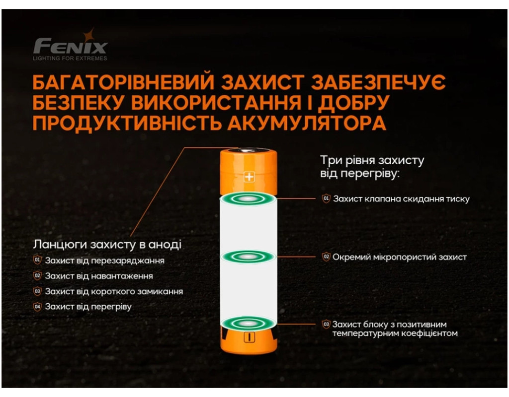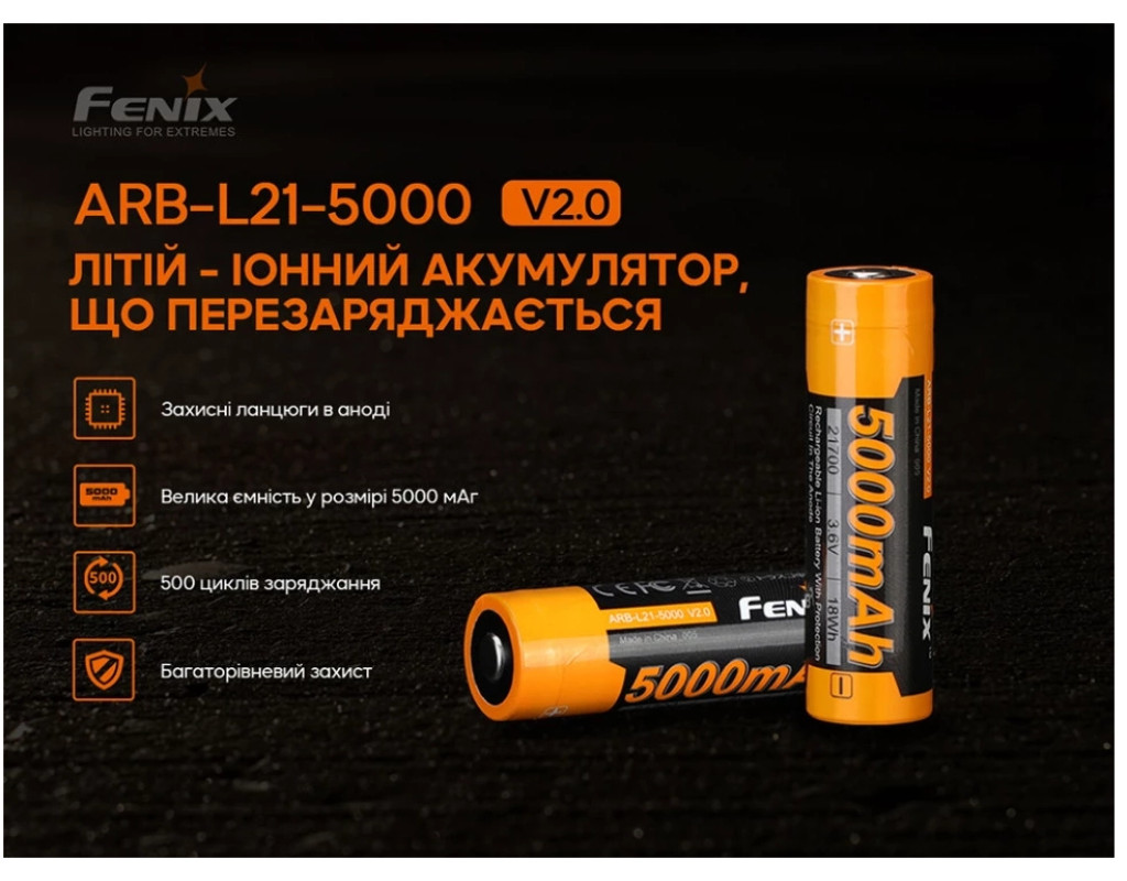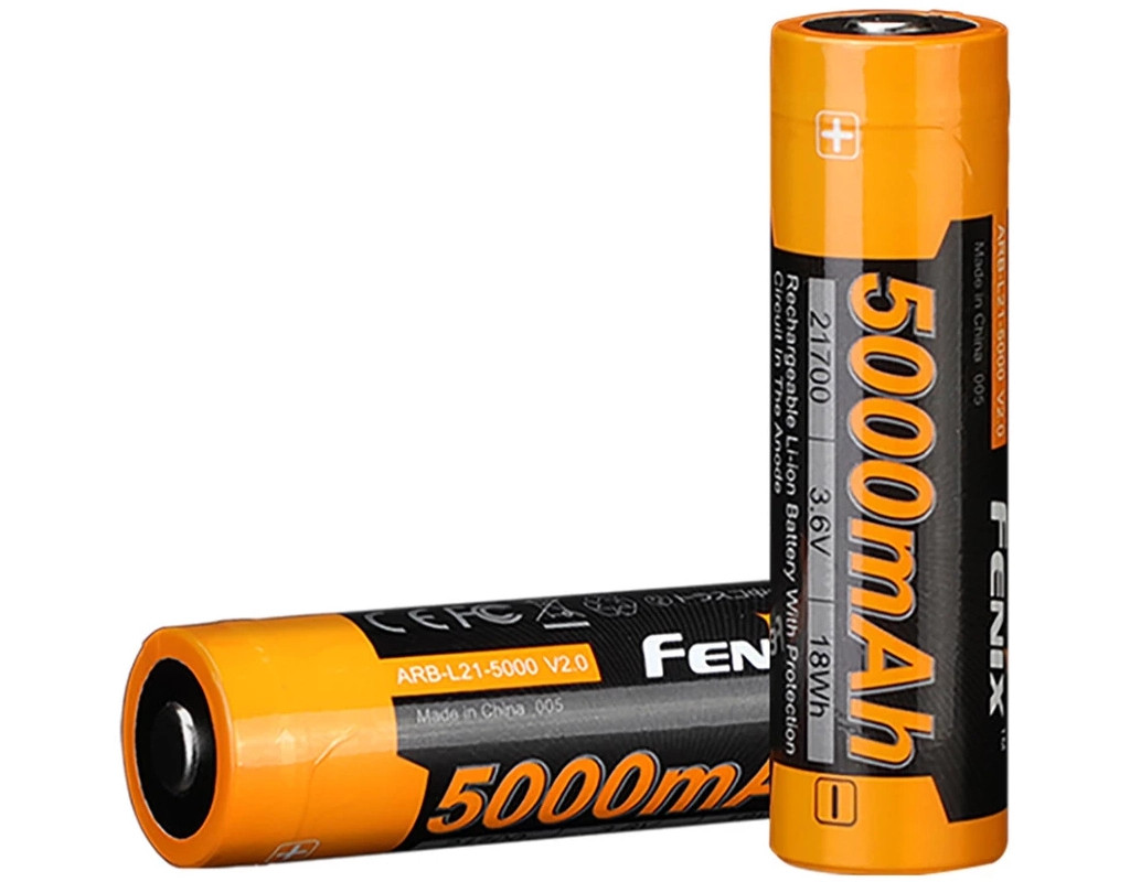 Акумулятор V2.0 є вдосконаленою версією ARB-L21-5000 і на відміну від попередньої моделі сумісний із усіма ліхтарями Fenix, що підтримують формат 21700. Елемент із номінальною напругою 3.6 В пропонує рекордну ємність 5000 мАг, яка дозволяє продовжити час роботи ручних ліхтарів на максимальних режимах. 500 повних циклів зарядки та розрядки гарантують стабільну роботу протягом щонайменше 12 місяців. Якщо елемент не використовується понад 3-х місяців, достатньо заново поповнити заряд для відновлення початкової ємності. Щоб підзарядити акумулятор, рекомендується використовувати пристрої із силою струму 1А, але не більше 5А. ARB-L21-5000 V2.0 має багаторівневий захист від перевантаження, короткого замикання та перегріву завдяки захисній платі, яка інтегрована в анод. Сталева оболонка запобігає виходу елемента з ладу у разі падіння з висоти та механічного впливу. У верхній частині корпусу є пара отворів, відповідальних за скидання надлишкового газу, який утворюється у разі внутрішнього короткого замикання. Це дозволяє уникнути роздмухування елемента з наступним вибухом і унеможливити пошкодження батарейного відсіку ліхтаря. Отвори знаходяться під захисною плівкою, тому в них не потрапляє волога та дрібні забруднення. Розміри акумулятора становлять 21.5 х 76 мм при вазі 73.5 г. Особливості: