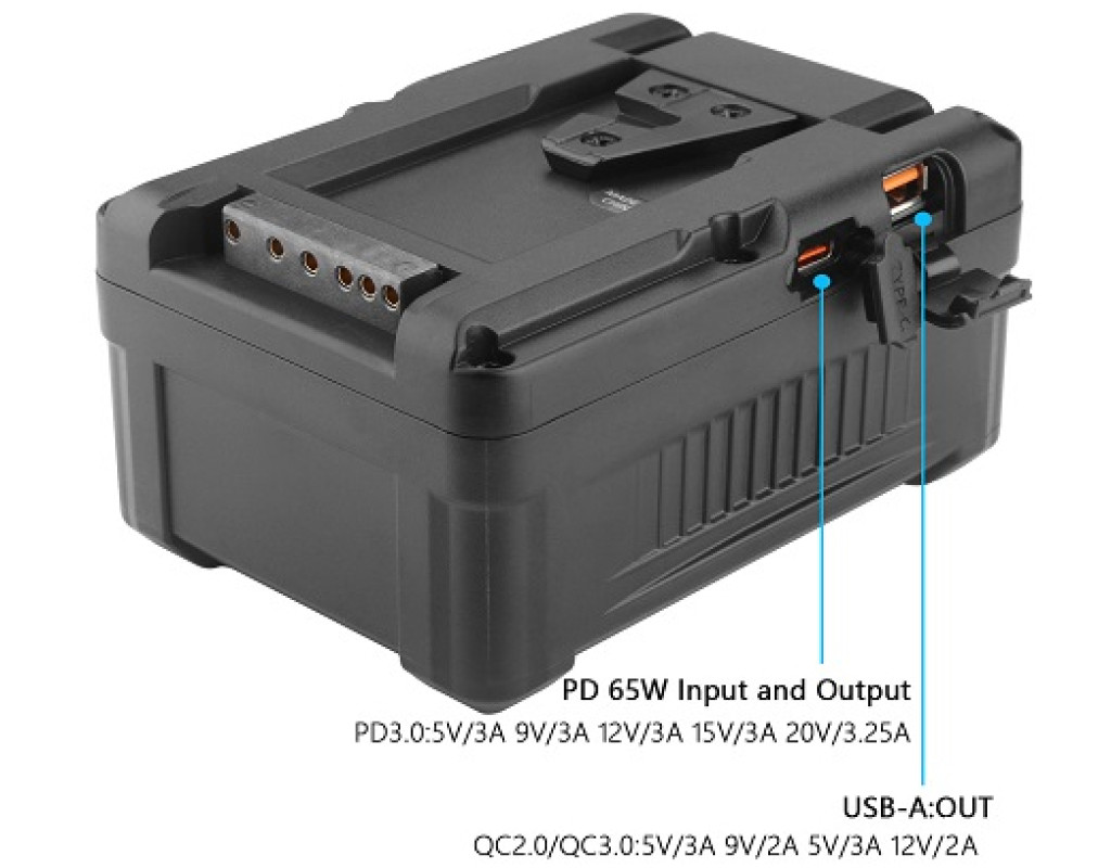 Змінний акумулятор для Sony BP-VL155 10500mAh. Він також може використовуватися як Power bank для заряджання широкого спектра пристроїв із PD 65W, швидкою зарядкою QC3.0, через роз'єми USB Type-C і USB Type-A (телефони, ноутбуки, планшети, електронні пристрої, світлодіодні лампи тощо). Має два порти D-TAP. Особливості: Підтримує протоколи: PD3.0, QC2.0, QC3.0, AFC, FCP, SCP, Apple-2.4A, PPS. Зі світлодіодним екраном, кнопкою ввімкнення/вимкнення, захистом з'єднання. Інтелектуальна система управління автоматично підлаштовує напругу або струм, роблячи роботу пристрою більш стабільною. Відсутній "ефект пам'яті". Низький рівень саморозряду. Тривалий термін служби акумулятора. Характеристики: - Ємність: 10500mAh.