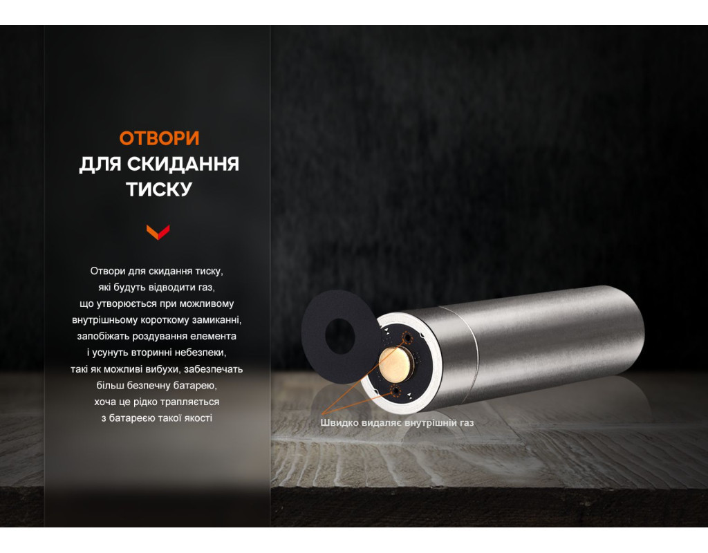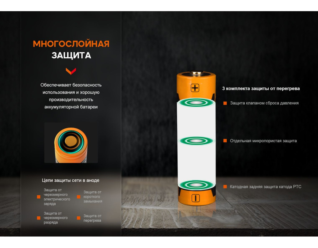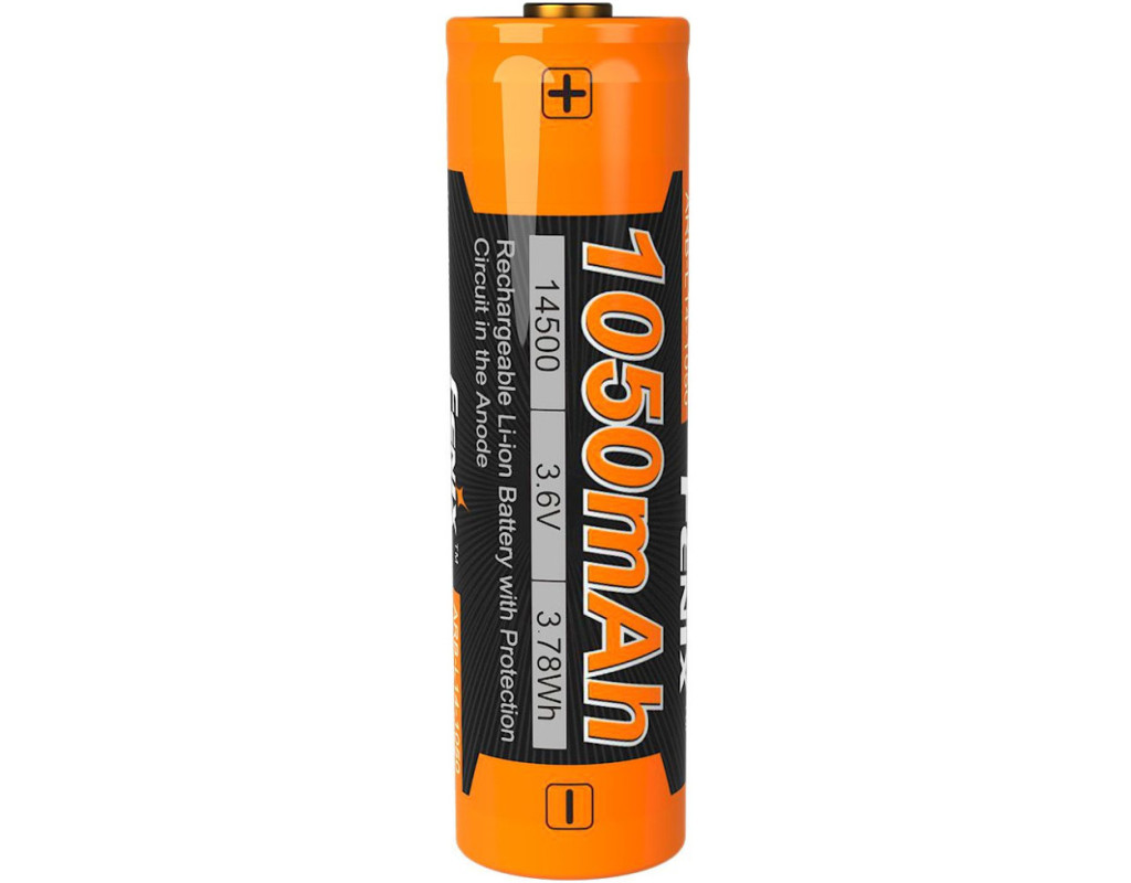 Літій-іонний акумулятор ARB-L14-1050 від Fenix ємністю 1050 мАгод. Номінальна напруга: 3.6 В. Він оснащений захистом від перегріву, клапанами для скидання надлишкового тиску та сталевим корпусом, що робить експлуатацію безпечною. Елемент живлення розрахований на близько 500 циклів заряджання. Його розміри складають 50.5 х 14.6 мм. Вага дорівнює 20±5 г. |