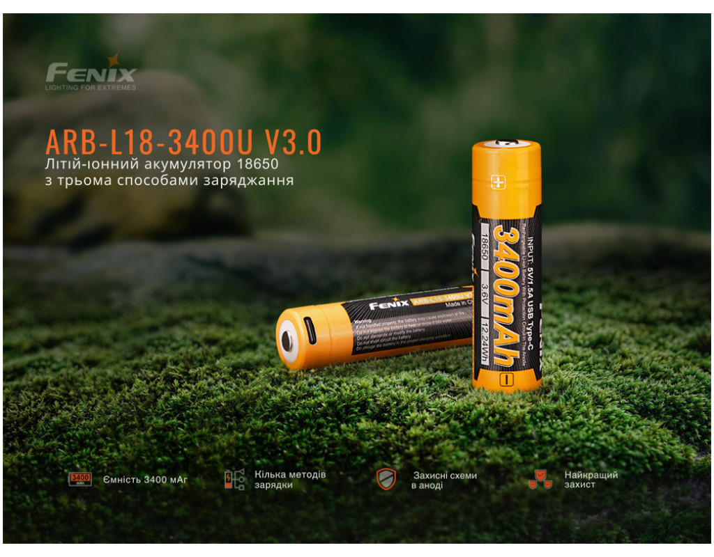 Акумулятор Fenix 18650 (3400 mAh) Type-C (ARB-L18-3400U-V30) є невід'ємною частиною будь-якого потужного пристрою, що потребує надійного джерела живлення. Цей акумулятор типу 18650 з електрохімічною системою Li-ion забезпечує стабільну роботу ваших пристроїв завдяки ємності в 3400 mAh. |