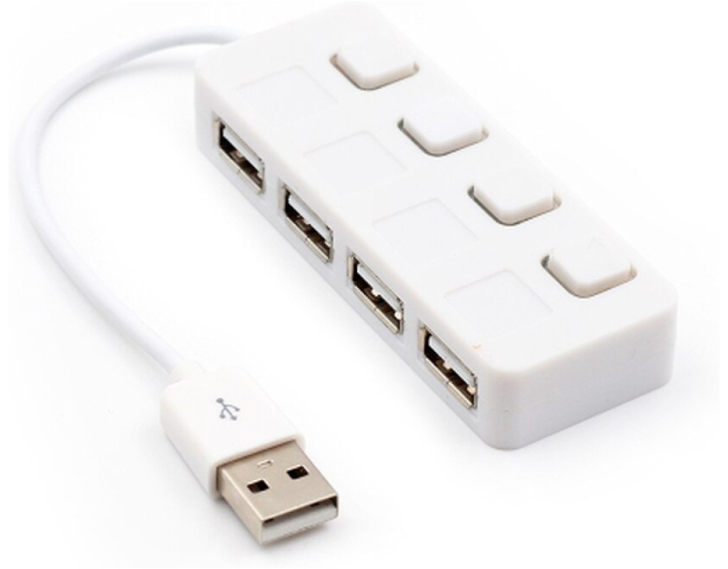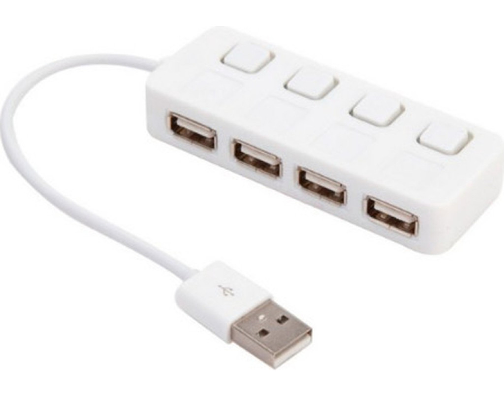 Хаб USB 2.0 універсальний Кількість роз`ємів (портів) USB2.0: Кабельне Телебачення Швидкість портів: до 480 Мбіт/с Живлення від USB порту Вимикач живлення хаба на шкірний порт Підсвітка LED портів: блакитна Підтримка операційних систем: 98/ME/Vista/2000/XP/7/8/10/Linux/Mac OS8.6 Підтримка об`єму пам`яті до 500 Гбайт Тип матеріалу: пластик Колір: білий Тип упаковки: Блістер