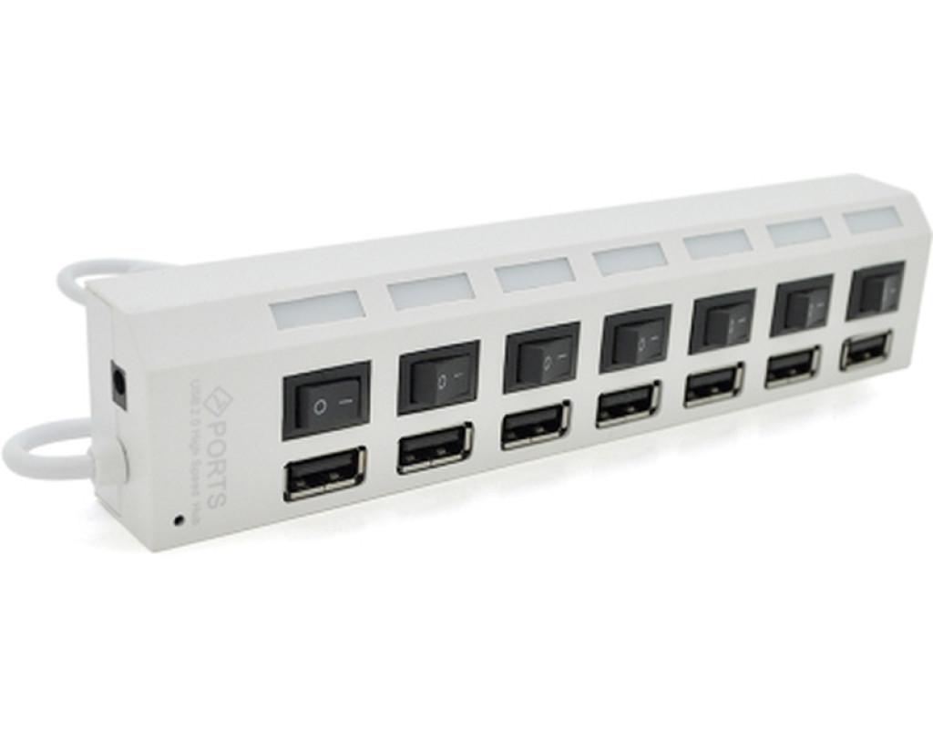 Характеристики: • Кількість портів USB 2.0: 7 шт. • Швидкість портів: до 480 Мбіт/с • Живлення: від USB порту • Перемикачі на кожному порту: Так • Підсвічування LED портів: синє • Операційні системи, що підтримуються: Windows 98 / ME / Vista / 2000 / XP / 7/8/10, Linux, Mac OS8.6 • Матеріал: пластик • Колір білий • Тип упаковки: Блістер