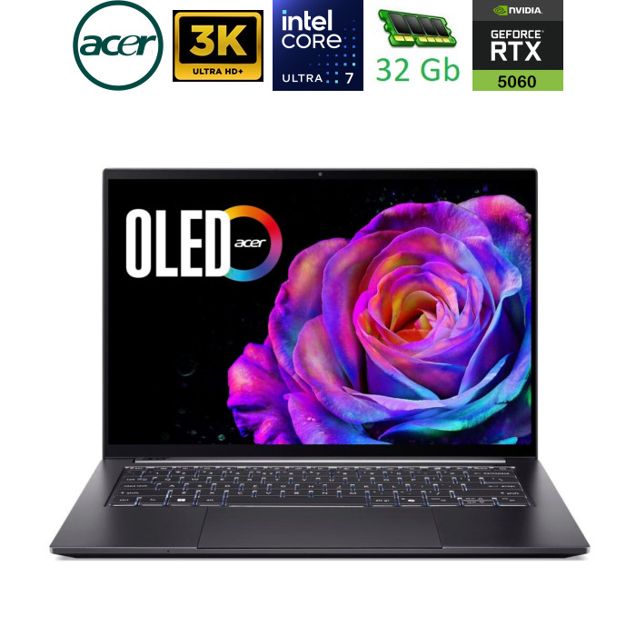 14.5", 2880x1800 (WQXGA ), OLED, 340nits, Intel Core Ultra 7 255H (1.5 - 5.1 ГГц), 32 ГБ, SSD - 1 ТБ, NVIDIA GeForce RTX 5060, GPU - 8 ГБ, DLSS 4, Windows 11 Home, 76 Втг, підсвічування клавіатури, сканер відбитків пальців, зарядка від USB, українська клавіатура, 1.58 кг, сірий