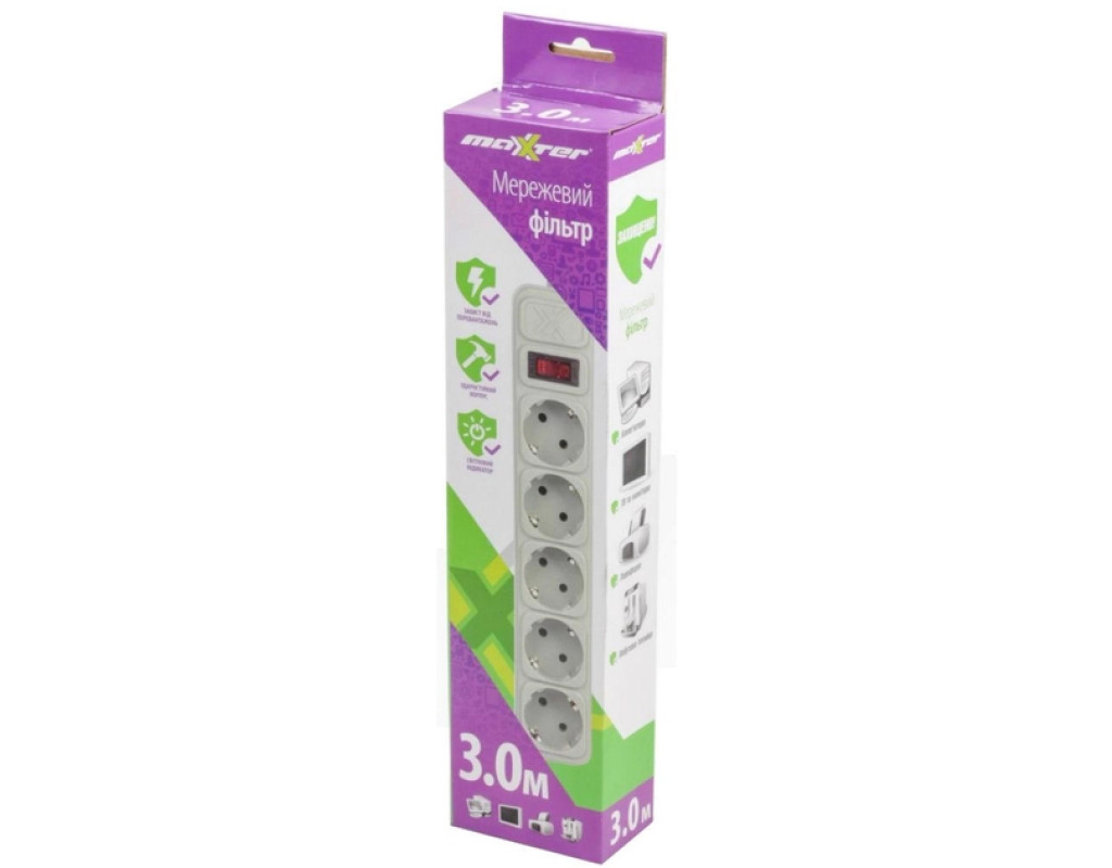 Мережний фільтр SPM5-G-10G від компанії Maxxter призначений для під'єднання широкого спектра побутової та електронної техніки, включно з чайниками й електронагрівачами. Пристрій з п'ятьма універсальними розетками з заземленням і довжиною кабелю 3 метри, виготовлений в ударостійкому пластиковому корпусі, має вбудований захист від перевантажень і короткого замикання, а також оснащений отвором для кріплення на стіні. Основні характеристики: