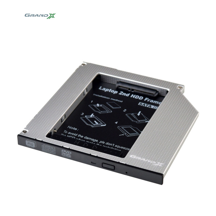 | Фрейм-адаптер Grand-X HDD 2.5" to notebook ODD SATA3 (HDC-26) для підключення HDD 2.5" у відсік приводу ноутбука. Адаптер призначений для підключення другого жорсткого диска (наприклад SSD) в ноутбук замість привода CD/DVD/Blue Ray. Особливості: пристрій Plug & Play - підключив і працює; швидке і надійне підключення другорядного жорсткого диска; повністю інтегрований в ноутбук, кабелі / блоки живлення / програмне забезпечення драйвера не потрібні; після установки двох HDD з'явиться можливість встановлення 2-ой операційної системи на додатковий жорсткий диск. Фрейм-перехідник сумісний з ноутбуками, відсік приводу у яких має висоту 9,5 мм і підключається по інтерфейсу SATA3. |