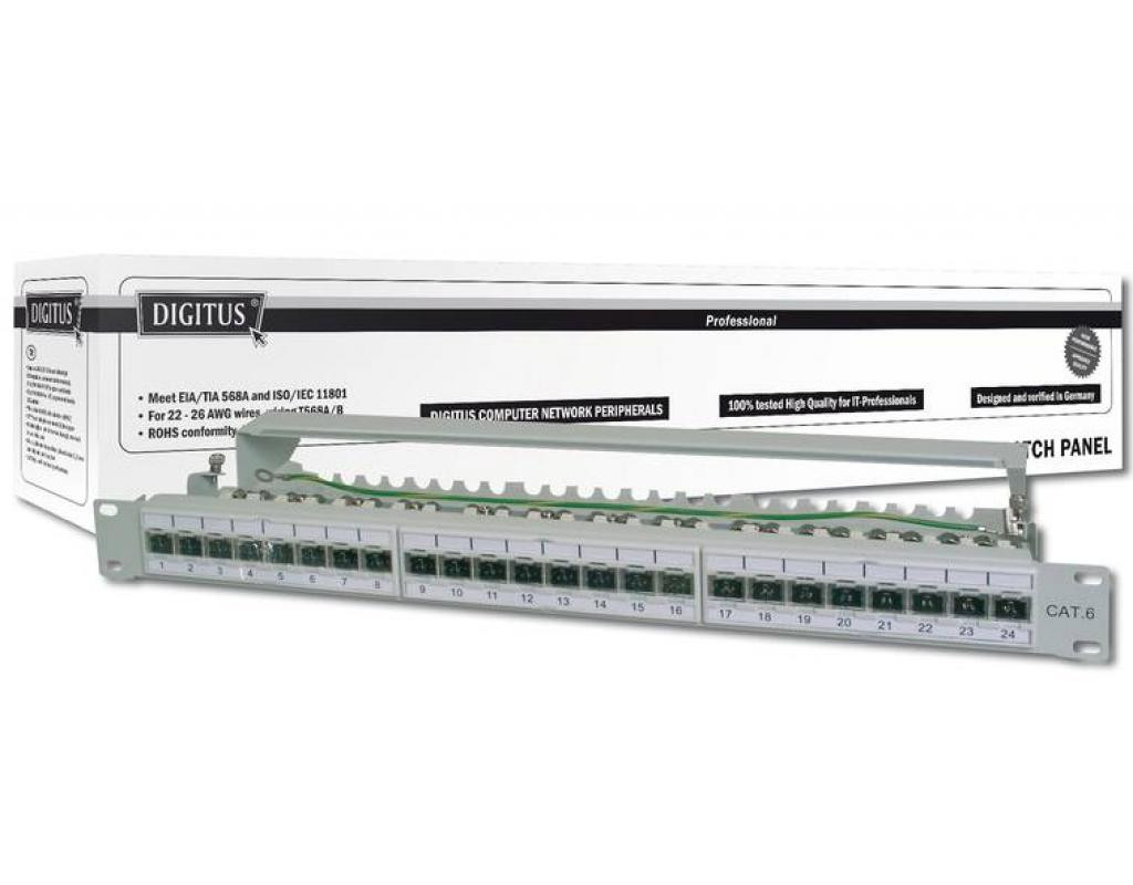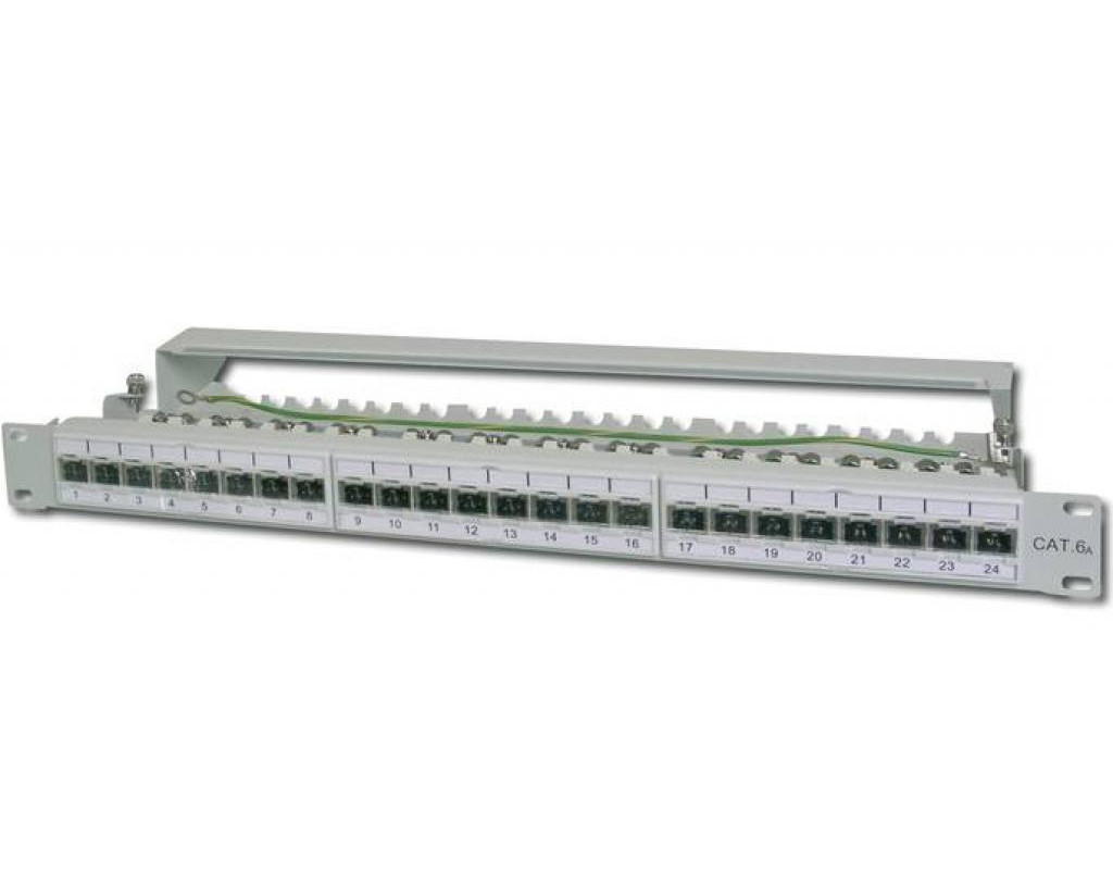 Патч-панель — одна із складових частин структурованої кабельної системи. Є панеллю з великою кsлькsстю сполучних роз'ємів, розташованих на лицьовій стороні панелі. На тильній стороні панелі знаходяться контакти, призначені для фіксованого з'єднання з кабелями, і сполучені з роз'ємами електрично. Комутаційна панель відноситься до пасивного мережевого устаткування. Монтується в будь-який зручний призначений для цього об'єкт: шафe, стійку, настінну раму або навіть на стіну. |