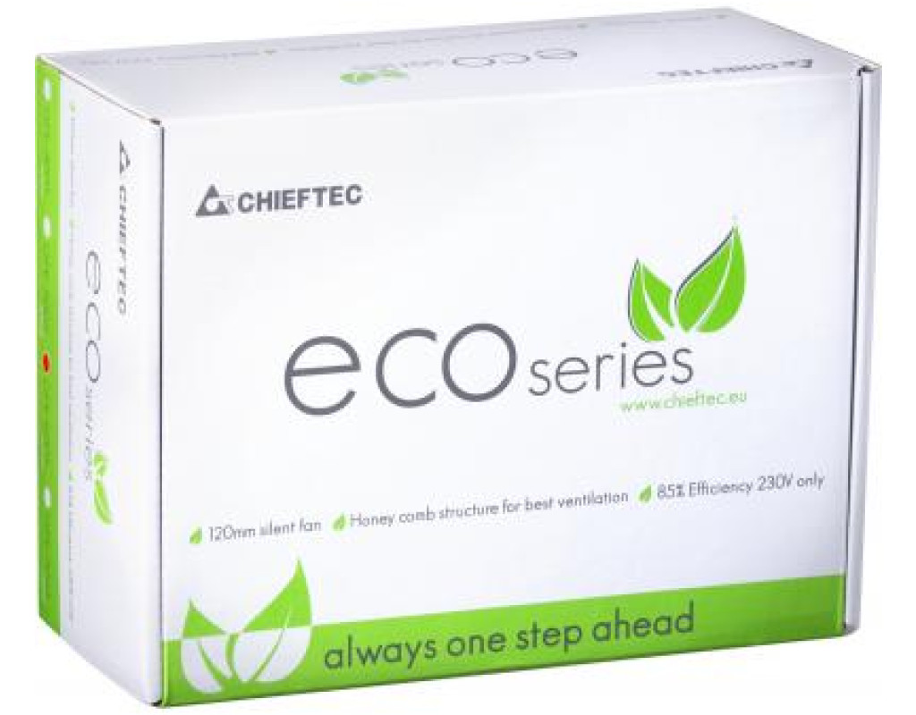 Chieftec Eco уособлює максимальну ефективність, екологічні цінності і нову енергетичну еру. Блок живлення сумісний з усіма діючими стандартами і сертифікований організацією TUV. Серед усього іншого він також має фіксований вольтаж 230 В відповідно з європейським стандартом. Саме тому серія Eco є надійним і ефективним компаньйоном для сучасних IT-структур.