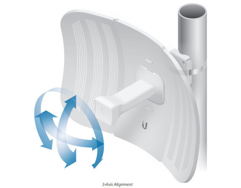 Також, LBE-M5-23 володіє унікальною кульової кріпильної системою, що надає гнучкість трьохвісьового регулювання в різноманітних варіантах монтажу. Система кріплення разом з бульбашковим рівнем дозволяє зробити націлювання просто і швидко. Використання технології airMAX На відміну від стандартного протоколу Wi-Fi, особливий протокол TDMA (Time Division Multiple Access – паралельний доступ з поділом у часі) airMAX фірми Ubiquiti дозволяє кожному клієнту посилати і приймати дані, використовуючи попередньо встановлені проміжки часу, регламентовані інтелектуальним контролером точки доступу. Цей метод «часових проміжків» зменшує приховані конфлікти вузлів і збільшує ефективність ефірного часу. У порівнянні з усіма іншими зовнішніми пристроями цього класу, LBE-M5-23 забезпечує значне поліпшення пропускної здатності і масштабованості, зменшує затримки. Інтелектуальний