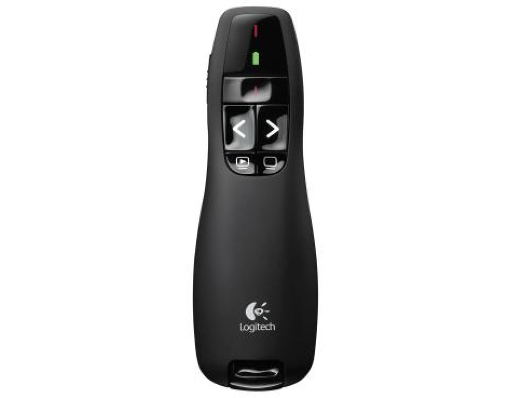 Logitech Wireless Presenter R400 - зручний безпровідний пристрій для проведення презентацій Інтуїтивно зрозумілі кнопки для перемикання слайдів легко розпізнати на дотик навіть у темряві. У пристрій вбудована лазерна указка. Елементи управління і лазерна указка з червоним променем дозволять впевнено проводити презентації навіть в абсолютно темних приміщеннях. Завдяки ергономічній формі пристрій зручно тримати в руці. Надійне управління від першого до останнього слайда. Пристрій працює на відстані до 15 метрів від приймача. Є індикатор заряду батареї, що працює від двох батарейок AAA. Презентер не вимагає налаштувань або установки драйверів при підключенні - просто підключіть приймач через USB-порт, і Logitech Wireless Presenter R400 готовий до роботи. Після роботи приймач можна прибрати всередину корпусу пристрою.