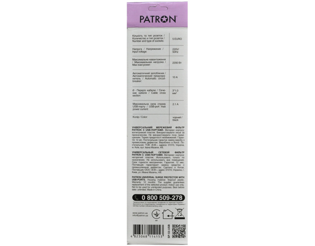 Чорний мережевий фільтр Patron SP-52 на 5 розеток призначений для підключення широкого спектру побутової та комп'ютерної техніки. Фільтр має універсальні розетки типу "євро" з заземленням і захищає електронну техніку від короткого замикання, перепадів напруги і імпульсних перешкод. Корпус мережевого фільтра виконаний з міцного негорючого пластику, мережевий шнур і контакти розеток — з міді.