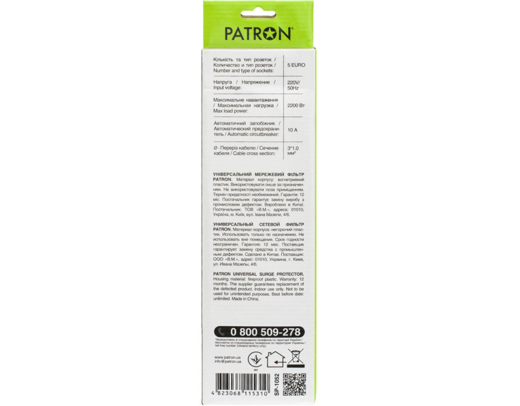 Мережевий фільтр Patron призначений для підключення широкого спектру побутової та комп'ютерної техніки. Фільтр має універсальні розетки типу "євро" з заземленням і захищає електронну техніку від короткого замикання, перепадів напруги і імпульсних перешкод. |