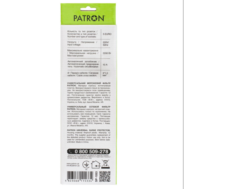 Мережевий фільтр Patron призначений для підключення широкого спектру побутової та комп'ютерної техніки. Фільтр має універсальні розетки типу "євро" з заземленням і захищає електронну техніку від короткого замикання, перепадів напруги і імпульсних перешкод. |