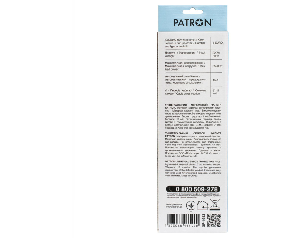 Мережевий фільтр Patron призначений для підключення широкого спектру побутової та комп'ютерної техніки. Фільтр має універсальні розетки типу "євро" з заземленням і захищає електронну техніку від короткого замикання, перепадів напруги і імпульсних перешкод. |