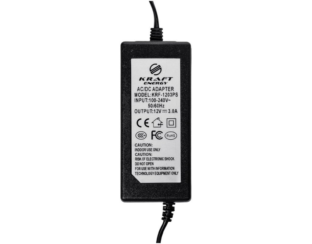 Kraft KRF-1203PS – компактний пластиковий триамперний блок живлення імпульсного типу, призначений для подачі стабілізованої напруги 12 Вольт на різне слаботочне обладнання. Допустима напруга по входу коливається від 110 до 220 Вольт. |