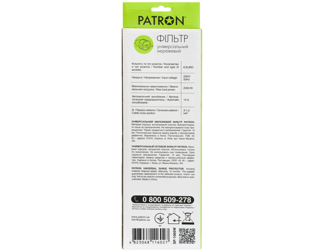 Мережевий фільтр живлення Patron 5m (SP-1065W) — це надійне рішення для захисту вашої електроніки. Завдяки довжині кабелю в 5 метрів, ви зможете легко дістатися до віддалених розеток, забезпечивши безперебійне живлення своїх пристроїв. Білий колір фільтра гармонійно поєднується з будь-яким інтер'єром, додаючи сучасний вигляд.