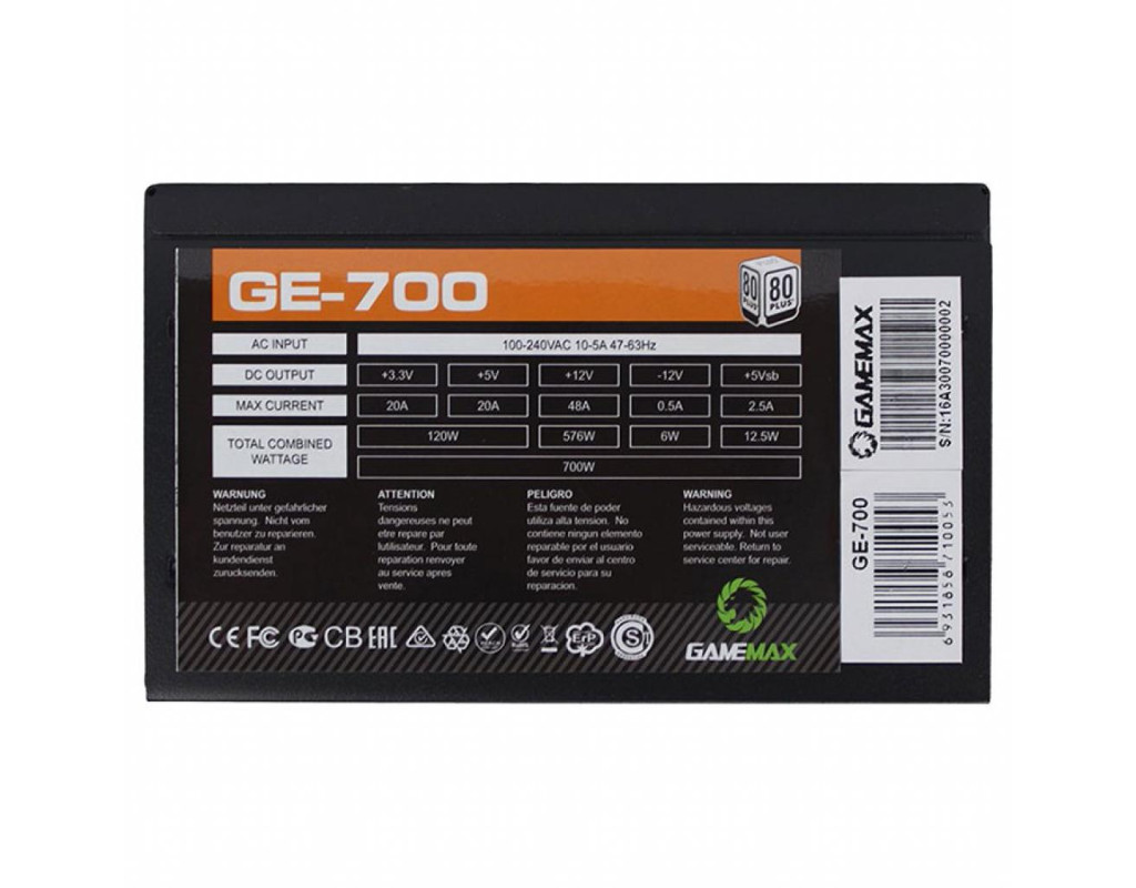 | Блок живлення Gamemax 700W (GE-700) — це ідеальне рішення для геймерів і тих, хто шукає надійний і потужний компонент для своєї комп'ютерної системи. Завдяки своїм характеристикам, цей блок живлення забезпечує стабільну роботу комп'ютера навіть при значних навантаженнях, роблячи його відмінним вибором як для ігрових ПК, так і для творчих станцій, які потребують високої продуктивності. Основою GameMax GE-700 є його потужність, яка становить 700 Вт. Це дозволяє йому легко впоратися з живленням компонентів найвищого класу. Стандарт ATX 12V v2.3 гарантує сумісність із більшістю системних блоків, а сертифікація 80 PLUS свідчить про високий рівень енергоефективності. Ефективне використання енергії не тільки знижує витрати на електроенергію, але й зберігає навколишнє середовище, що робить цей блок живлення екологічно дружнім вибором. Активний модуль PFC (Power Factor Correction) забезпечує підвищену стабільність живлення та оптимальну продуктивність, зводячи до мінімуму втрати енергії. Це означає, що ваш комп'ютер отримує потрібну йому потужність з максимальною ефективністю. Завдяки підключенню 20+4 pin для материнської плати та 4+4 pin для процесора, цей блок живлення підходить для широкого спектру сучасних материнських плат і процесорів, забезпечуючи гнучкість та зручність при встановленні. Особливу увагу варто звернути на можливості підключення відеокарт — два роз'єми 6+2 pin дозволяють підключити навіть найдосконаліші моделі відеокарт, не хвилюючись про нестачу живлення. Крім того, блок живлення оснащено п'ятьма роз'ємами SATA для підключення різних накопичувачів і трьома Peripheral для додаткових пристроїв, що в цілому забезпечує велику гнучкість і зручність у використанні. Охолодження забезпечується вентилятором діаметром 120 мм, який працює тихо, що особливо важливо для тих, хто цінує мінімізацію шуму в роботі ПК. Це робить GameMax GE-700 практично беззвучним під час роботи при звичайних навантаженнях, а отже, сприяє комфортній атмосфері для роботи або гри. Блок живлення також відрізняється широким спектром технологій захисту, включаючи OPP (захист від перевантаження по сумарній потужності), UVP (захист від зниженої напруги), SIP (захист від стрибків струму і напруги), SCP (захист від короткого замикання), OVP (захист від підвищення напруги) та OCP (захист від перевантаження по струму на кожному каналі). Це гарантує безпеку та довговічність усіх підключених компонентів, заспокоюючи користувача щодо надійності даного блоку живлення. З габаритами 150 x 140 x 86 мм, GameMax GE-700 ідеально вміщується в стандартних корпусах, забезпечуючи легкість монтажу та чудову організацію внутрішнього простору. Надійність, ефективність і доступна ціна роблять цей блок живлення відмінним вибором для широкого кола користувачів. Виберіть GameMax GE-700 для вашої системи і насолоджуйтесь якістю, на яку можна покластися! |