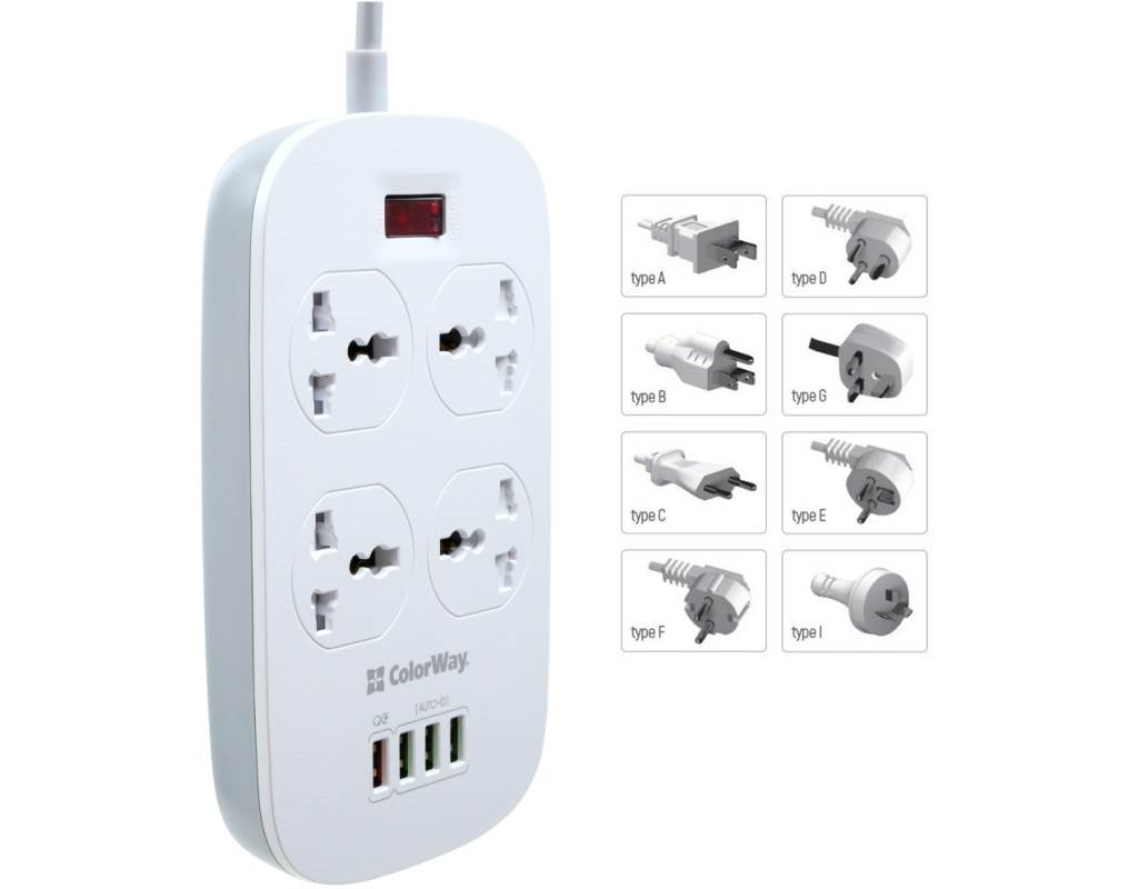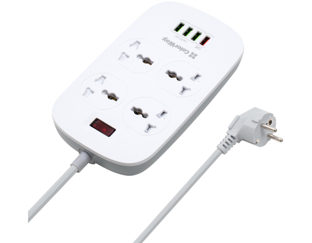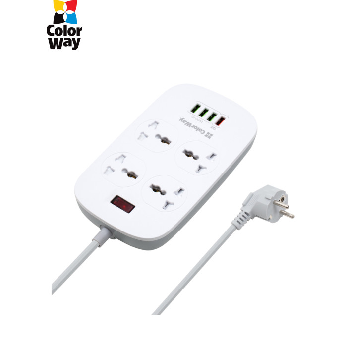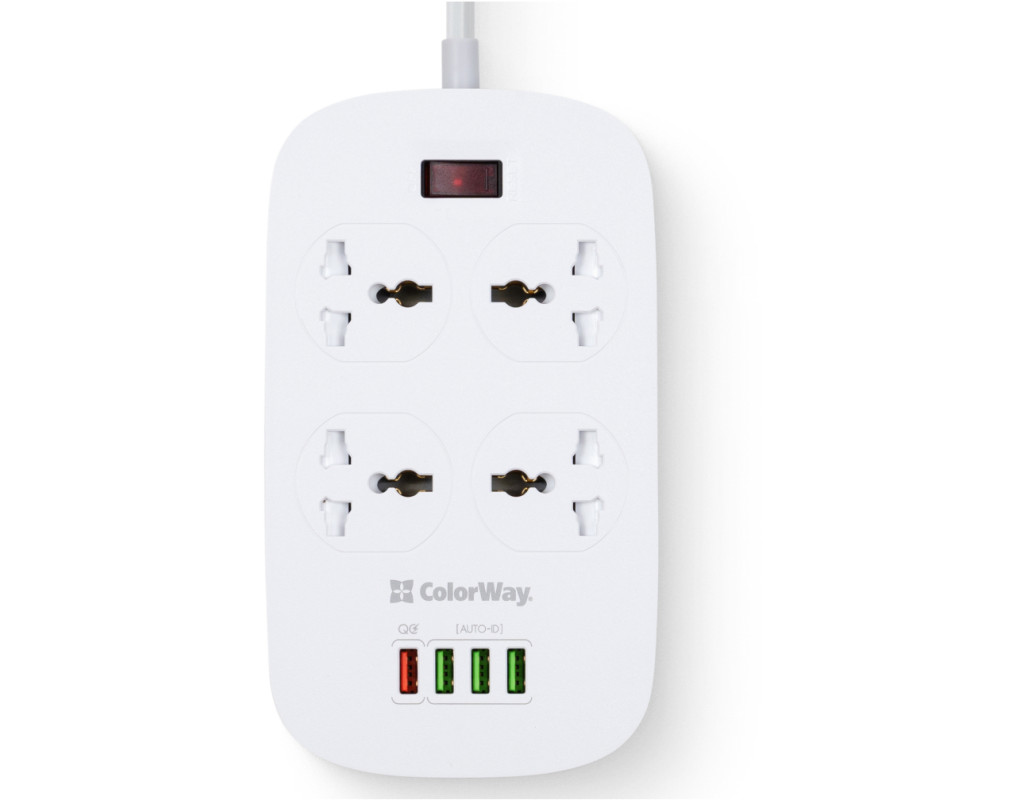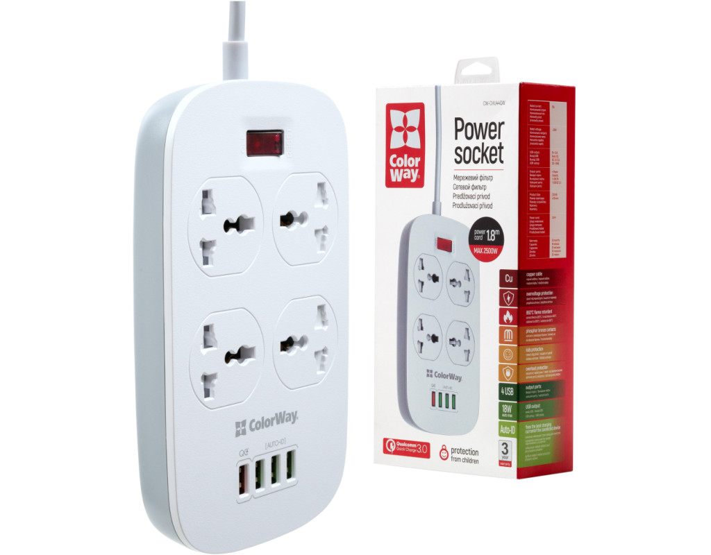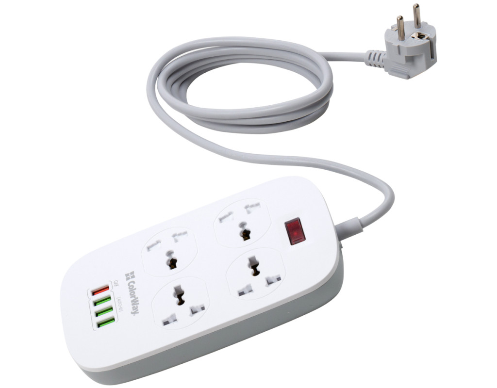 Подовжувач, з чотирма мережевими розетками 220В і 4 USB портами 5В. З його допомогою можна підключати не лише електроприлади, але і одночасно заряджати до 4 х мобільних пристроїв: смартфони, планшети, зовнішні батареї і багато інших пристроїв, які підтримують зарядку від USB порту. Один з представлених USB-портів має більшу вихідну силу струму і підтримує технологію швидкої зарядки Quick Charge 3.0 - Потужна USB зарядка, з максимально гарантованим навантаженням на всі порти 18W, дозволяє заряджати декілька пристроїв одночасно