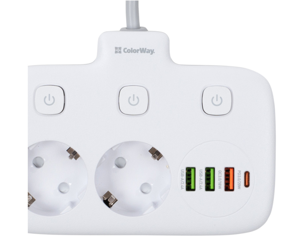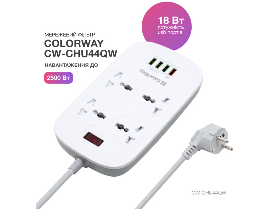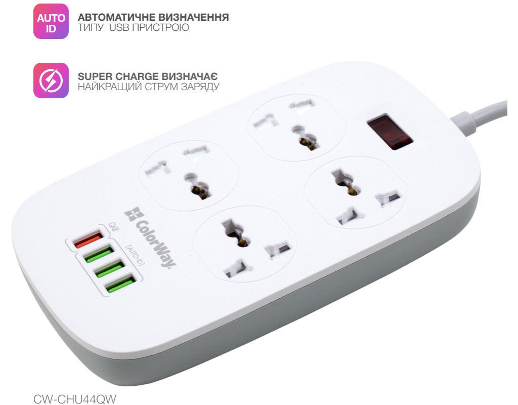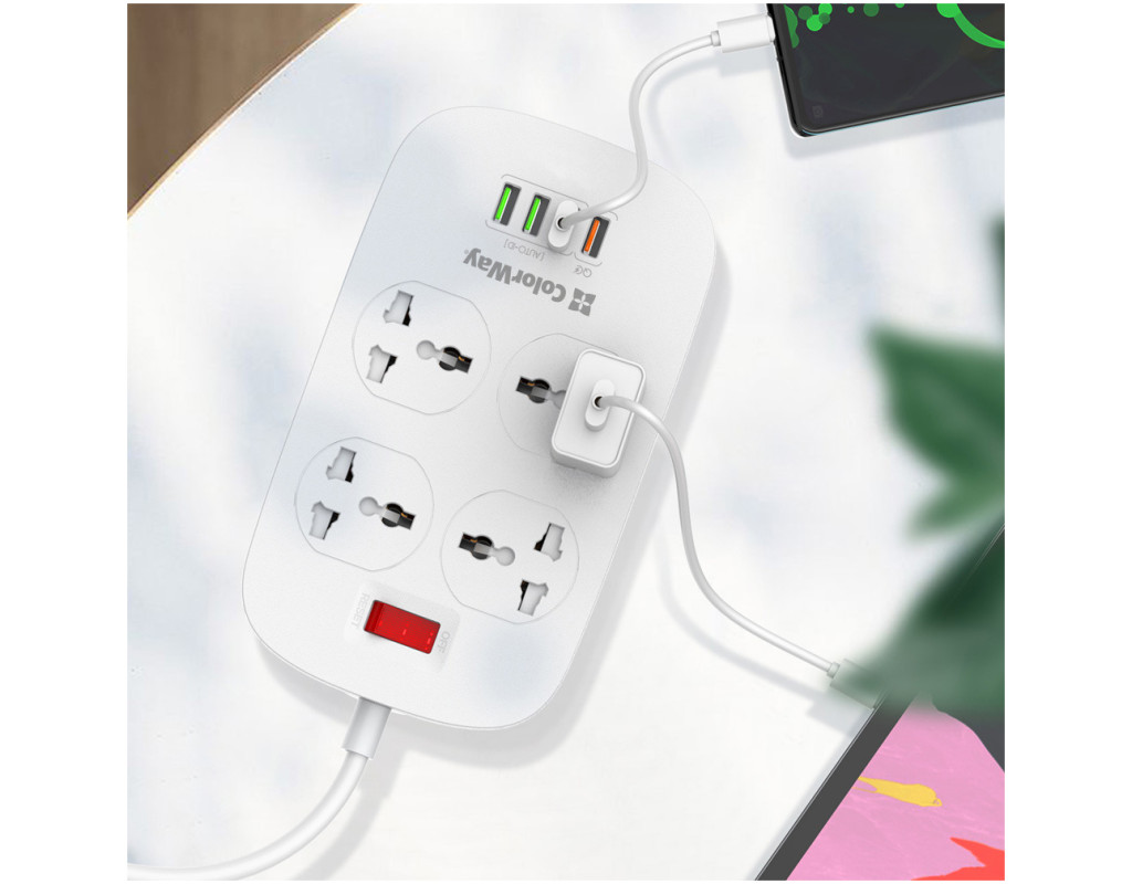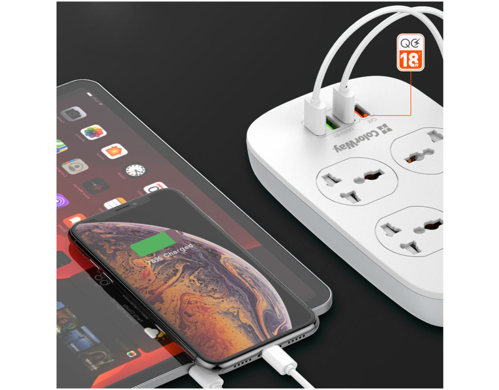 Подовжувач, з чотирма мережевими розетками 220В і 4 USB портами 5В. З його допомогою можна підключати не лише електроприлади, але і одночасно заряджати до 4 х мобільних пристроїв: смартфони, планшети, зовнішні батареї і багато інших пристроїв, які підтримують зарядку від USB порту. Один з представлених USB-портів має більшу вихідну силу струму і підтримує технологію швидкої зарядки Quick Charge 3.0 - Потужна USB зарядка, з максимально гарантованим навантаженням на всі порти 18W, дозволяє заряджати декілька пристроїв одночасно