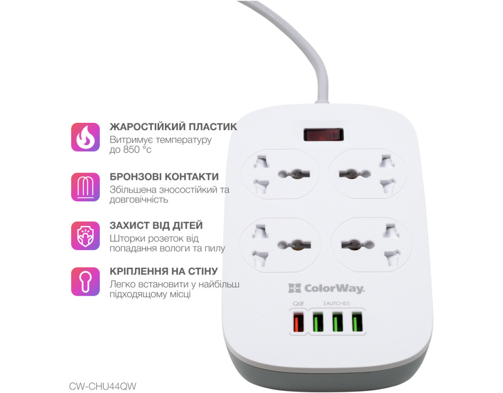 - Чотири універсальні розетки 220В, із заземленням і захистом від перенапруги