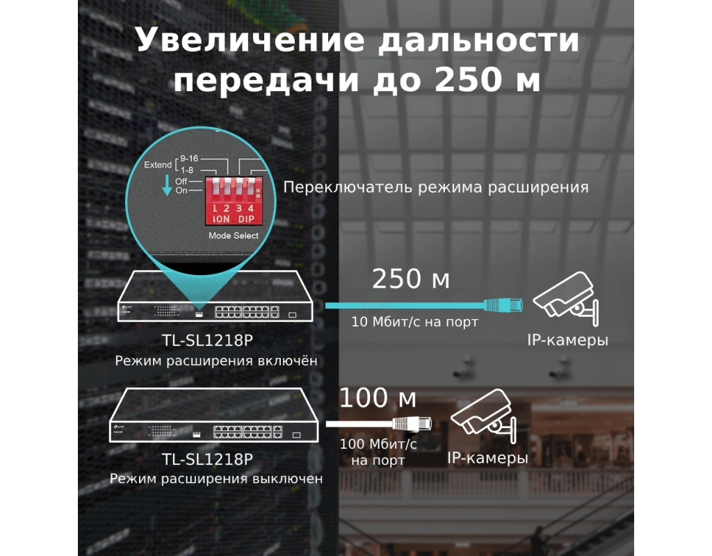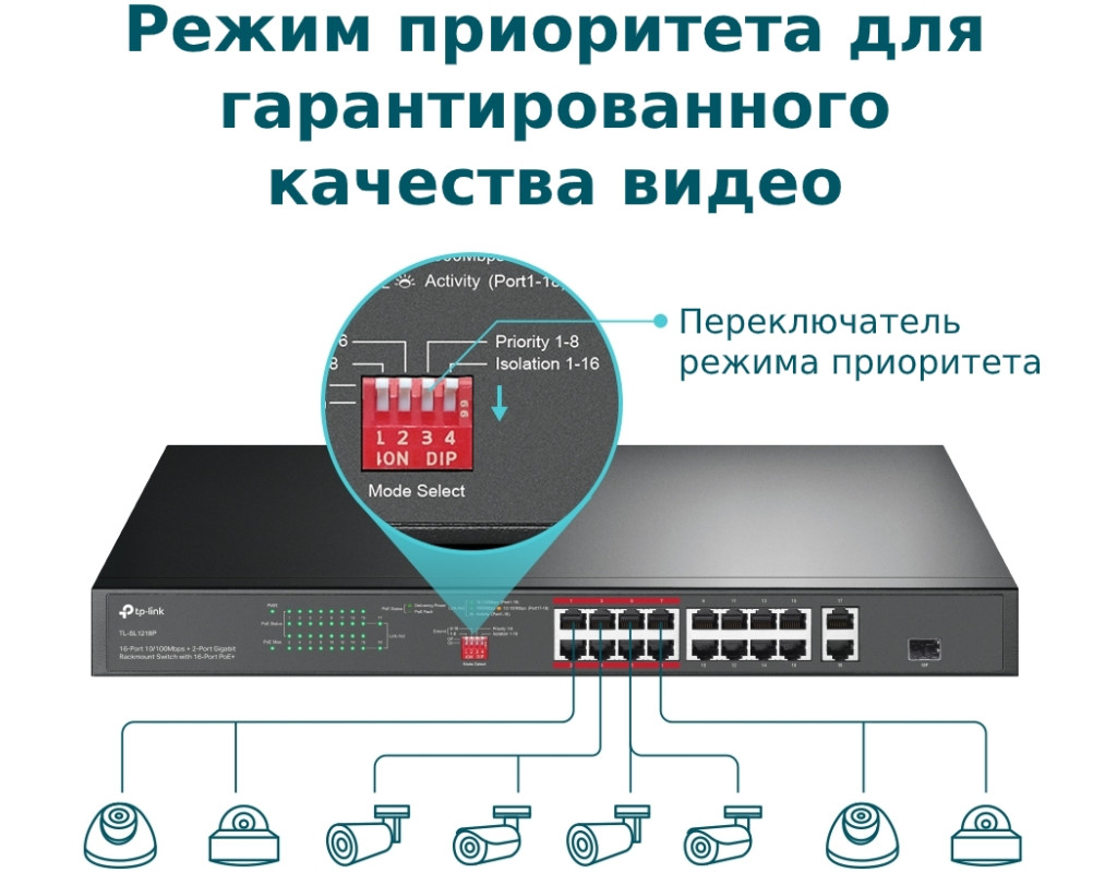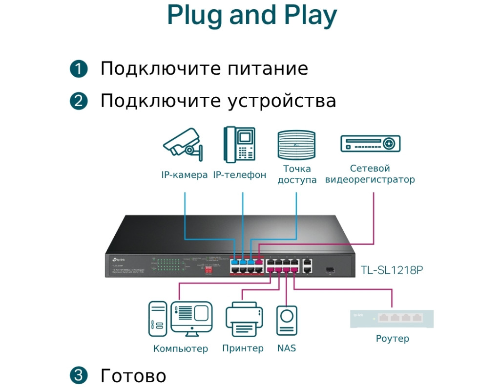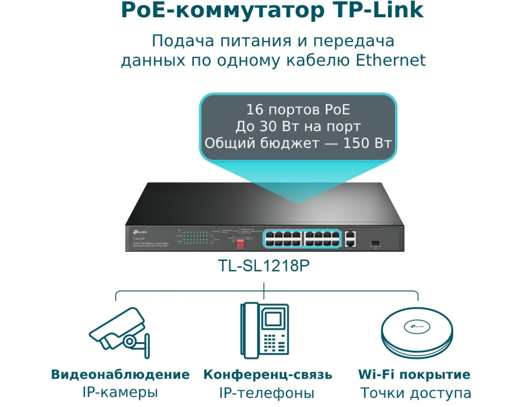 Завдяки відповідності стандарту PoE+ 802.3af/at кожен порт PoE підтримує до 30 Вт, а загальний бюджет PoE 150 Вт* для 16 портів PoE+ відкриває низку можливостей, наприклад, створення відеоспостереження для офісів, гуртожитків та малого бізнесу. TL?SL1218P повністю сумісний з IP?камерами, точками доступу, IP?телефонами, комп’ютерами, принтерами та не тільки. |