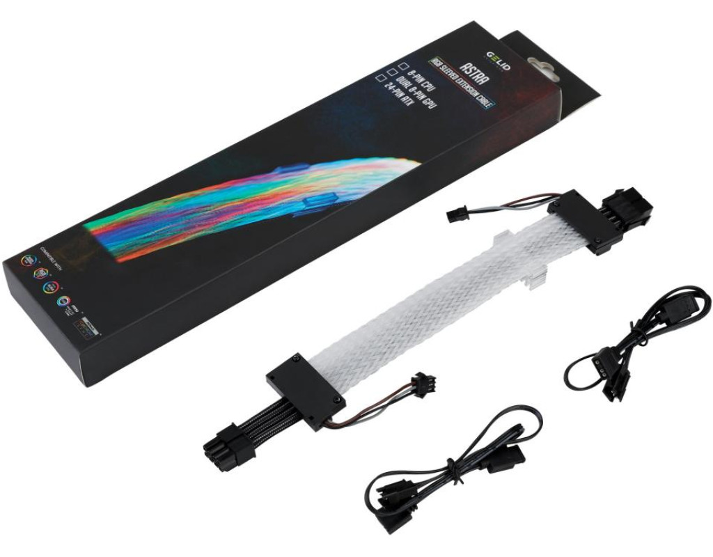 Gelid Astra ARGB 8P (6+2) CPU/PCIe має спеціальне оптоволоконне обплетення та 8 надяскравих світлодіодів RGB, об'єднаних у двосторонньому модулі освітлення, які можуть похвалитися безмежно яскравими ефектами RGB. Його дуже легко встановити, а також легко згинати. Кабель у зібраному вигляді має товщину всього 20 мм, щоб забезпечити безпроблемне під'єднання до материнської плати та графічного процесора. Характеристики: