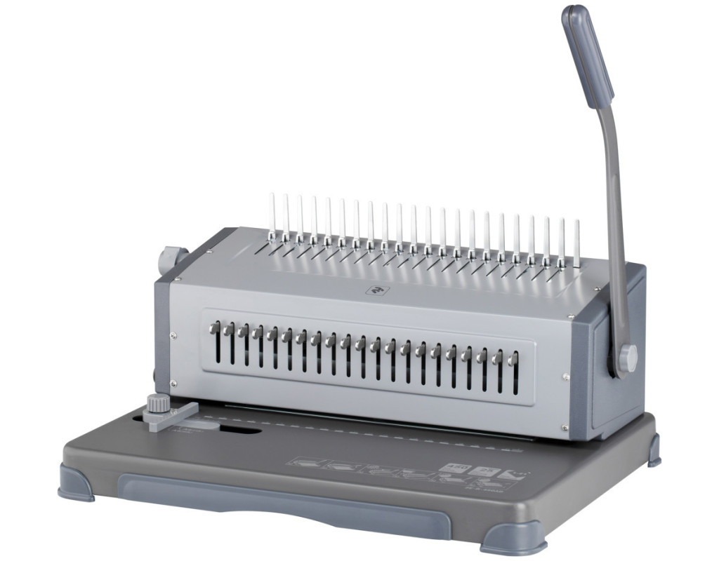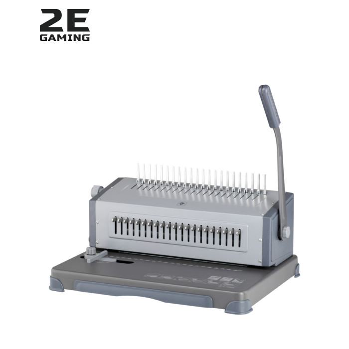 Вид переплетіння - пластикова пружина, спосіб перфорації - горизонтальна, максимальна товщина документа - 450 аркушів, 520 х 370 х 270 мм