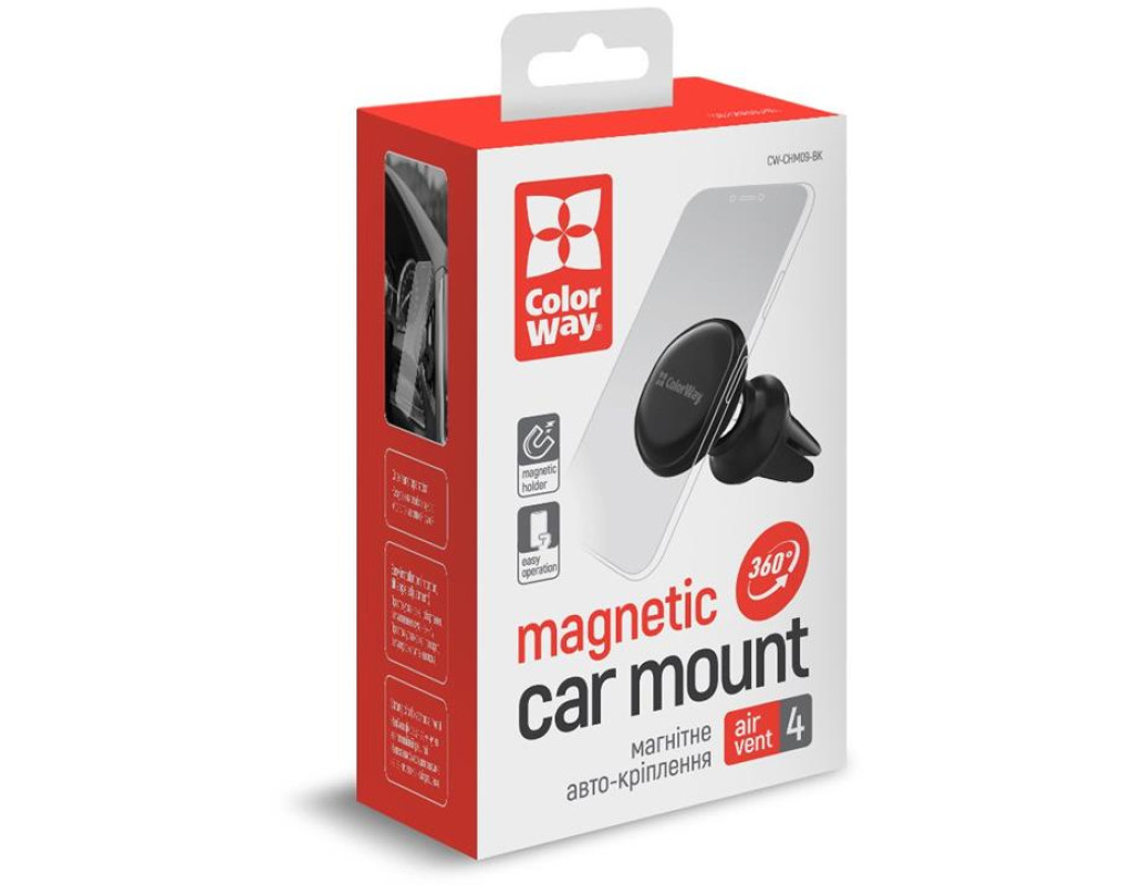 | Тримач автомобільний СolorWay для телефону магнітний Metallic Air Vent-4 (360 ° rotation) Black забезпечує надійну фіксацію вашого смартфона в автомобілі. Легко встановлюється на вентиляційну решітку на зручній Вам висоті завдяки прогумованим ніжкам, які виключають можливість падіння або вислизання як самого кріплення, так і закріпленого на ньому смартфона. Фіксація самого телефону здійснюється завдяки чотирьом потужним магнітам всередині тримача і прикріпленою до смартфону магнітній пластині. Завдяки обертаючий конструкції пристрій забезпечує мобільність і можливість повороту смартфона для максимальної зручності і оптимального кута огляду. Тримач автомобільний сумісний практично з будь-яким смартфоном, гарантуючи надійне кріплення гаджета і зручне його використання. Аксесуар відрізняється довговічністю, адже виготовлений з якісних матеріалів: металу і SoftTouch-пластика. А завдяки компактному стильному дизайну він буде чудово виглядати в салоні будь-якого авто.