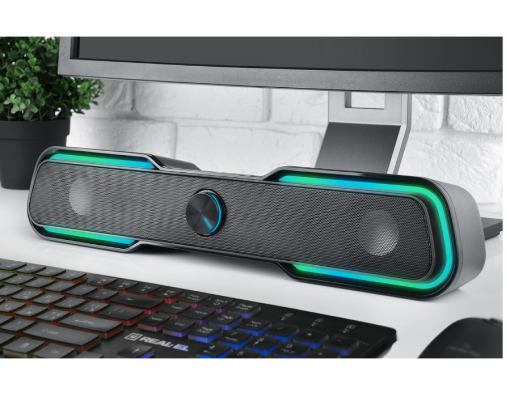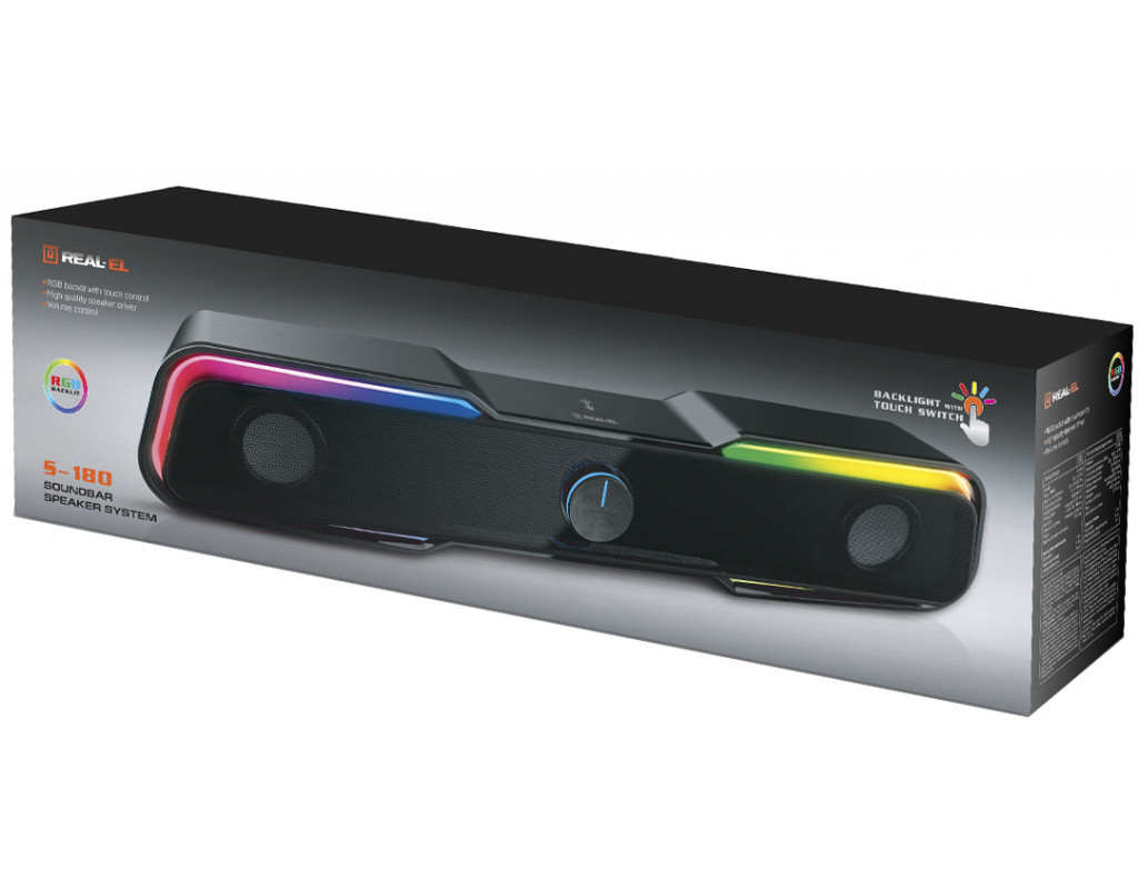 Саундбар REAL-EL S-180 це якісна звукова панель з RGB підсвічуванням для прослуховування музики і озвучування аудіо, відео контенту. Модель S-180 це компактна технологічна і сучасна альтернатива класичним колонок, яка зазвичай розміщується під монітором. Спеціальні звукові камери з фазоінверторами і динаміками всередині корпусу створюють неймовірно насичений об'ємний потужний стерео звук. Сучасний дизайн з багатобарвним підсвічуванням, сенсорне управління, металева сітка, регулятор гучності з вбудованим світлодіодним індикатором стане ідеальним доповненням Вашого інтер'єру. |